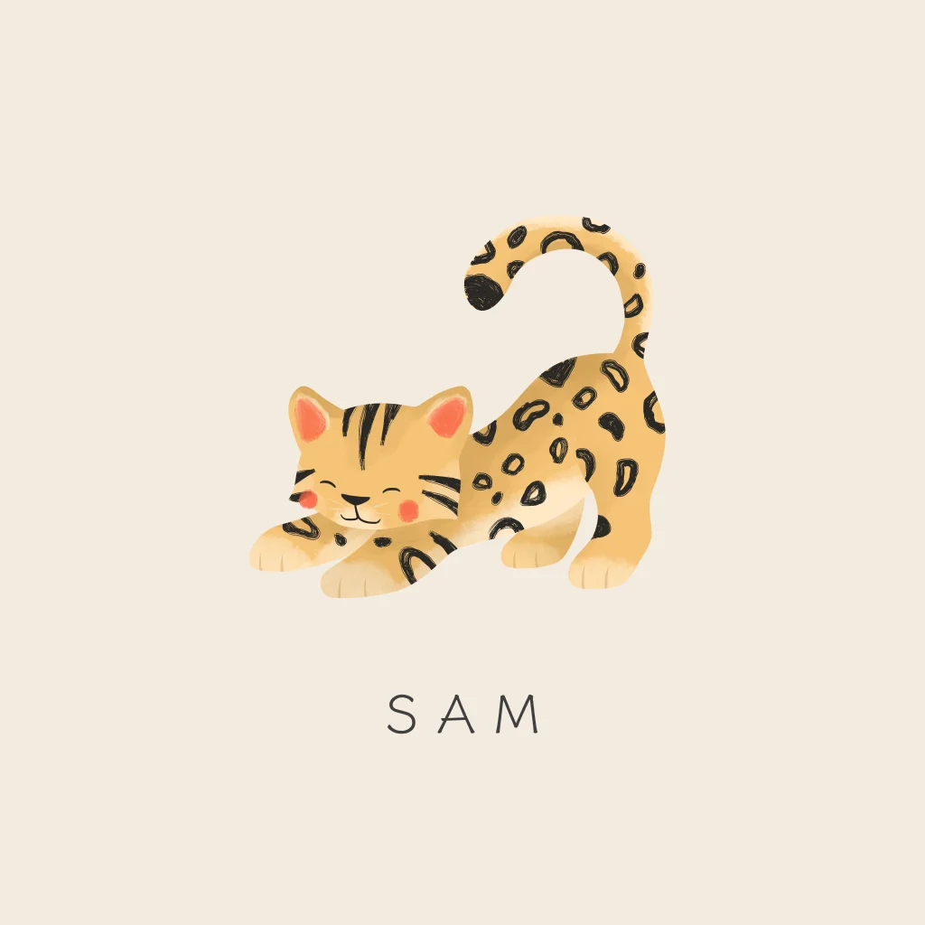 Lief aquarel geboortekaartje voor een jongen of een meisje. Op dit dieren babykaartje Sam een schattig luipaard of tijger welpje