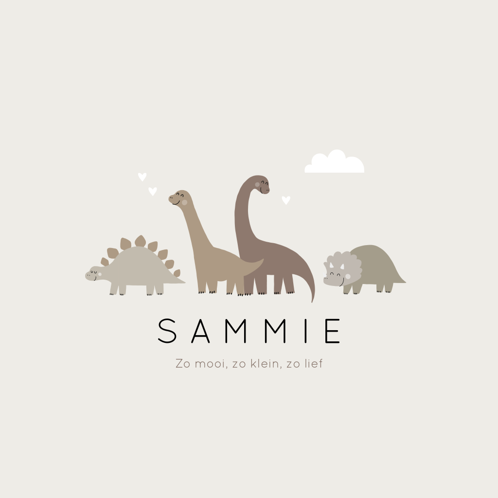 Genderneutraal geboortekaartje met dinosaurussen en hartjes. Door het gebruik van trendy bruintinten heeft dit babykaartje Sammie een rustige uitstraling. Teksten, kleuren en silhouetten kun je eenvoudig aanpassen in de editor. Dit geboortekaartje is ook mogelijk voor een andere gezinssamenstelling.