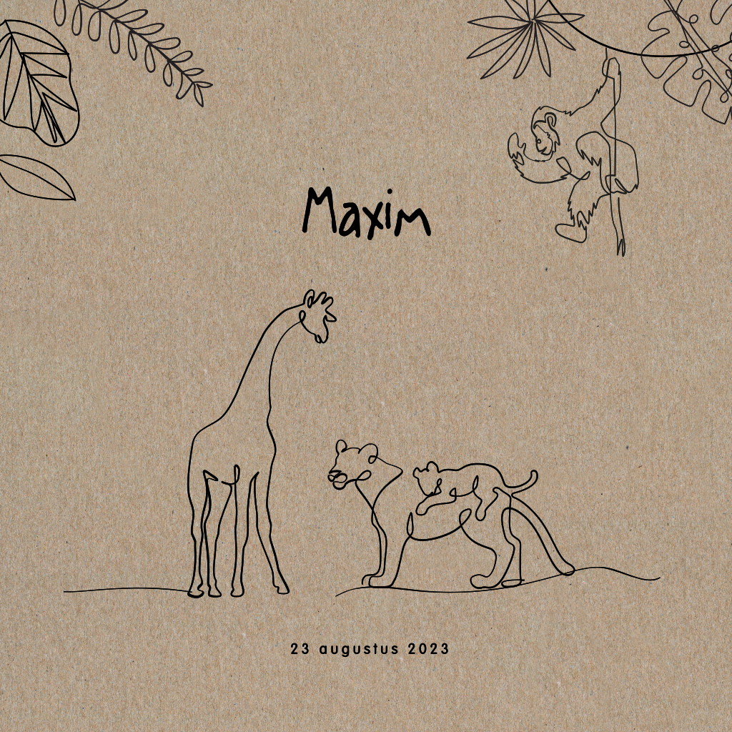 Hip geboortekaartje op écht kraft papier met one line illustraties van verschillende jungle dieren, waaronder een giraffe, een leeuw met een klein welpje op zijn rug en een slingerend aapje. Dit unisex kaartje Maxim is geschikt voor zowel een jongen als een meisje. Het kaartje heeft een rustige en lieve uitstraling, maar door het échte kraft papier, met een mooie dikke structuur, krijgt het kaartje een stoere uitstraling.