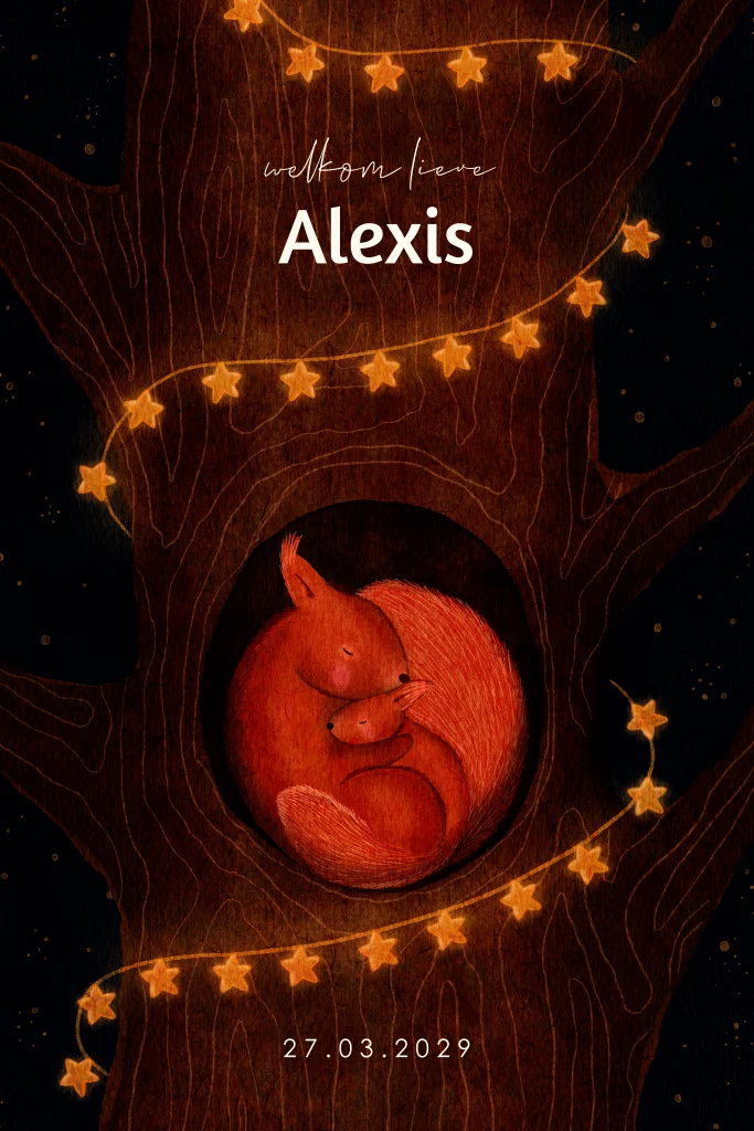 Prachtig geïllustreerd geboortekaartje voor een jongen of meisje. Dit unisex geboortekaartje Alexis is getekend door onze designer Danique. Je ziet een eekhoorn moeder met haar baby in een boom. Om de boom een sfeervolle lampenslinger van sterren. Dit warme originele geboortekaartje is perfect voor ouders die van het bos houden of waarvan hun kindje in de winter of herfst wordt geboren. Pas de kaart naar je eigen smaak aan in onze ontwerpmodule.