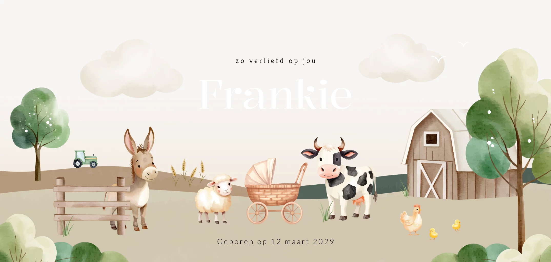 Boerderij geboortekaartje met verschillende boerderijdieren, waaronder een koe, ezel en schaap. Je ziet de dieren bij een kinderwagen staan. De kleuren van dit geboortekaartje zijn neutraal, daardoor is dit geboortekaartje unisex en geschikt voor zowel jongens als meisjes. De foliedruk geeft een luxe glans aan dit kaartje. Pas dit geboortekaartje Frankie geheel naar eigen wens aan in de editor. Hulp nodig? Wij helpen je graag!