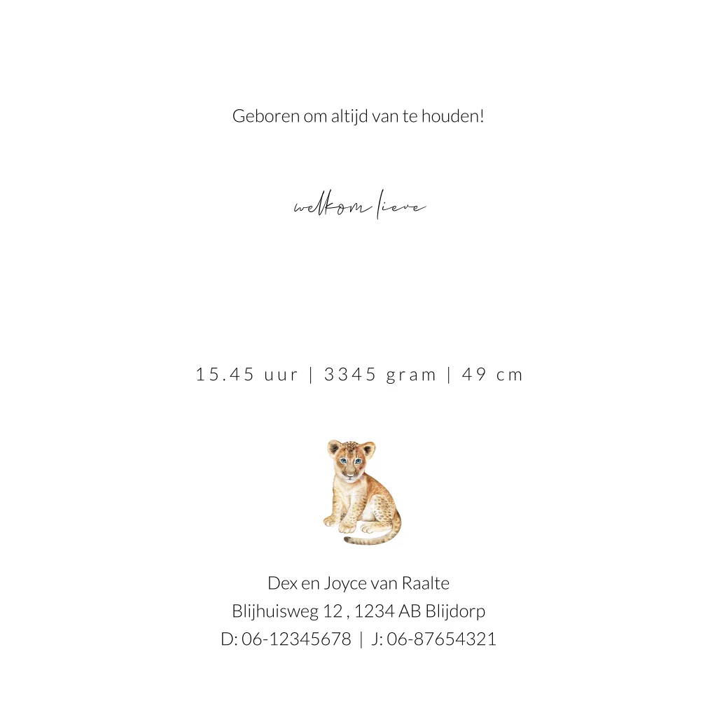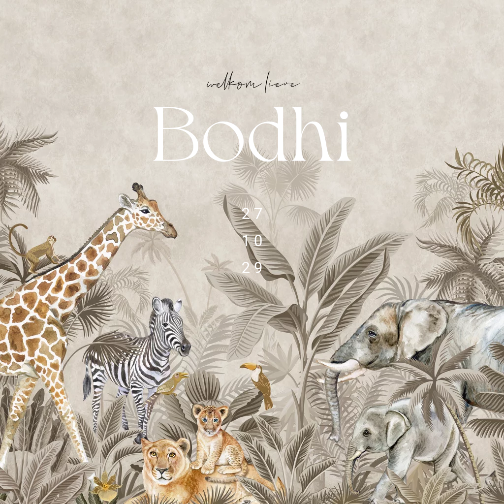 Dit prachtige unisex geboortekaartje Bodhi met goud foliedruk is een unieke manier om de komst van jullie zoon of dochter aan te kondigen. Op het kaartje zie je verschillende jungledieren zoals een olifant, leeuw, giraf, aapje en zebra. Het geboortekaartje heeft neutrale kleuren en dit maakt het kaartje zowel geschikt voor een jongen als een meisje. Het goudfolie geeft een extra luxe uitstraling. Met de wit met gouden inlay envelop en de bijpassende sluitzegel maak je het geboortekaartje helemaal af.
