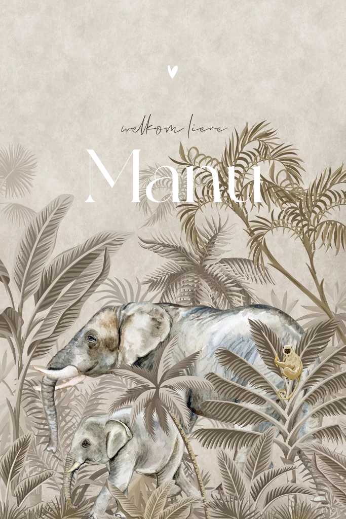 Een prachtig unisex geboortekaartje voor een zoon of dochter. Op dit kaartje zie je een grote olifant en een baby olifantje door de jungle lopen. Dit geboortekaartje Manu heeft neutrale kleurtinten wat het kaartje geschikt maakt voor zowel een jongen als een meisje. Pas dit geboortekaartje naar eigen wens aan in onze online editor. Zowel op de voorzijde als op de achterzijde van dit kaartje is er gebruik gemaakt van goudfolie voor een extra vleugje luxe. Met de bijpassende sluitzegel maak je dit mooie geboortekaartje helemaal af.