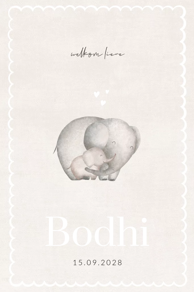 Dit prachtige geboortekaartje Bodhi met foliedruk is perfect voor jullie zoon of dochter. Met schattige geïllustreerde olifantjes straalt dit kaartje warmte en tederheid uit. Goudfolie voegt een vleugje luxe toe aan het ontwerp, waardoor het geboortekaartje extra opvalt. Dit geboortekaartje heeft een golvend kader en is geschikt voor een broertje of zusje, tweede kindje. Pas dit schattige kaartje voor jullie jongen of meisje aan in onze online editor om dit kaartje helemaal eigen te maken.