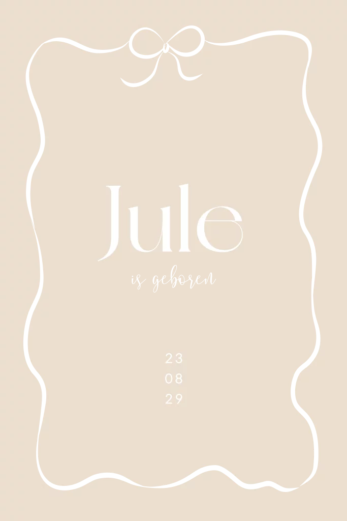Op zoek naar een stijlvol unisex geboortekaartje? Kies dan voor dit geboortekaartje Jule! Dit prachtige geboortekaartje met goudfolie en een speels kader met strikje is perfect om de geboorte van jullie zoon of dochter aan te kondigen. Het goudfolie zorgt voor een extra vleugje luxe. Deze stijlvolle, klassieke geboortekaart is voorzien van afgeronde hoeken en een bijpassende metallic beige envelop. Dit geboortekaartje is geïnspireerd op het kaartje van Jaydi Dubois.