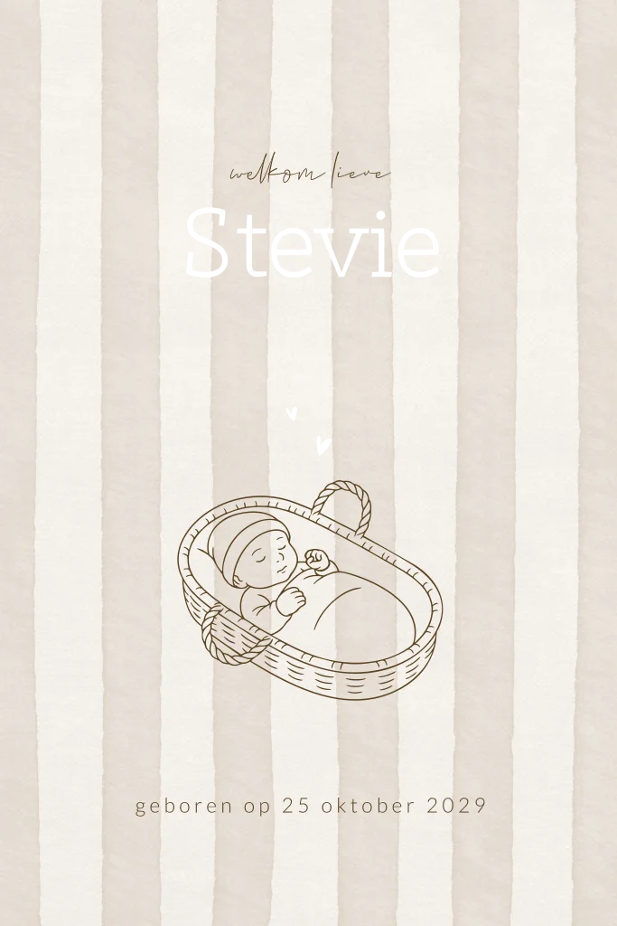 Een prachtig unisex geboortekaartje voor een jongen of een meisje. Dit geboortekaartje Stevie heeft een design van een lijntekening van een baby in een mandje. De achtergrond is gestreept in beigekleur. De ronde hoeken en het goudfolie zorgen voor een luxe touch. Je kunt dit geboortekaartje voor jullie zoon of dochter zelf gemakkelijk bewerken in onze online editor. Het is ook mogelijk om een lijntekening op maat te maken, stuur ons gerust een berichtje!