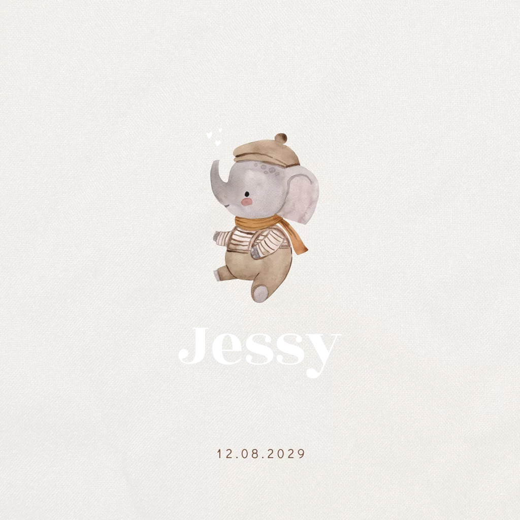 Lief geboortekaartje voor een jongen of meisje. Dit geboortekaartje Jessy is unisex en daardoor geschikt voor zowel een jongen als een meisje. Je ziet een schattige aquarel schildering van een olifantje met kleertjes aan. De afgeronde hoeken en goudfolie maken dit neutrale geboortekaartje helemaal af.