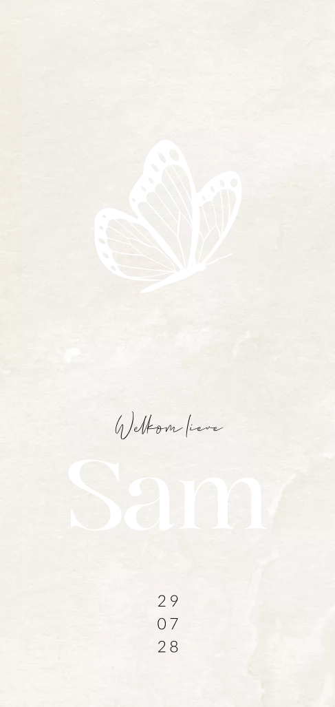 Ben je op zoek naar een uniek en stijlvol ontwerp voor de aankondiging van jullie kindje? Dan is ons geboortekaartje Sam precies wat je zoekt. De combinatie van rustige beige kleuren, een subtiele foliedruk in de naam en de vlinder en de afwerking met ronde hoeken straalt dit kaartje een tijdloze elegantie uit. De vlinder is een symbool van transformatie en nieuw leven, wat perfect past bij de aankondiging van de geboorte van jullie kindje. Door de rustige kleuren kan dit kaartje voor zowel een jongen als een meisje en is deze dus genderneutraal.