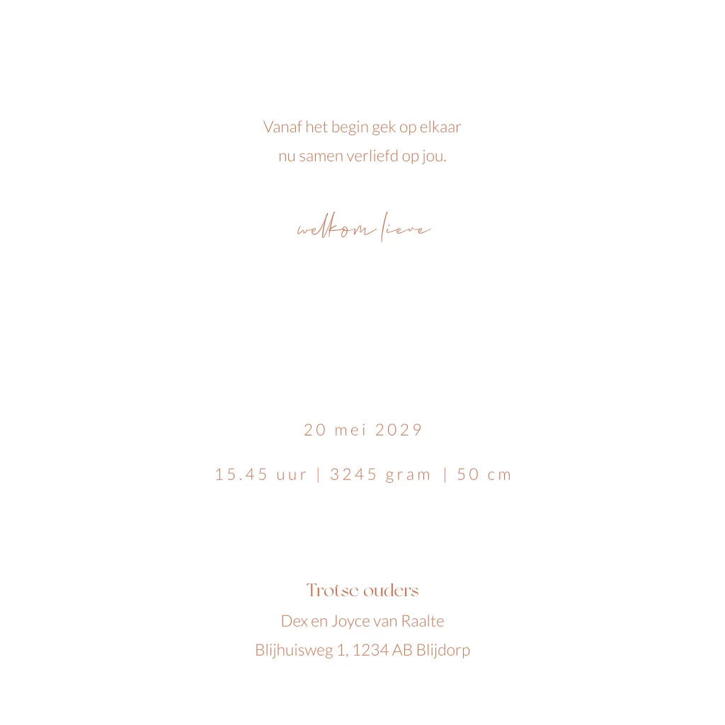 Genderneutraal geboortekaartje voor een jongen of meisje met meerdere zonnetjes. De naam van jullie zoon of dochter wordt gedrukt in echt goudfolie waardoor deze er extra uitspring en het kaartje een exclusieve uitstraling geeft! Je kunt dit unisex geboortekaartje Nima naar je eigen wensen aanpassen in de editor. Hulp nodig bij het ontwerpen? Neem contact met ons op!