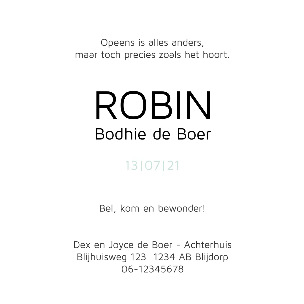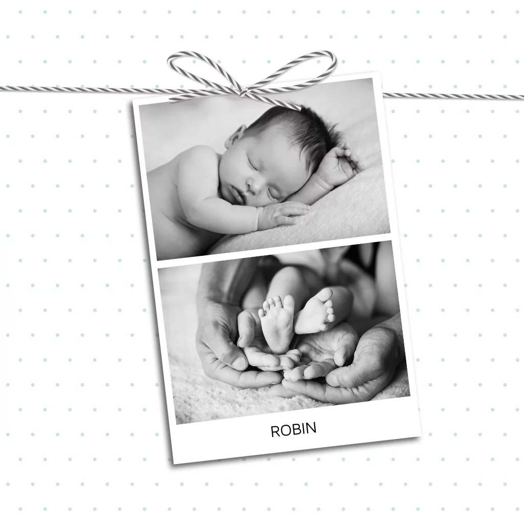 Rustig foto geboortekaartje met stippen op de achtergrond en een strikje. Het strikje op deze baby kaart is niet echt, maar wordt gedrukt. Op deze kaart is er ruimte voor twee foto's. De naam Robin staat onder de foto's. Deze kaart is eenvoudig op te maken.