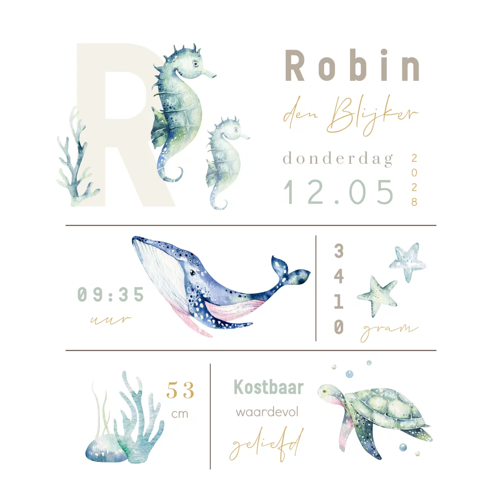 Geboortegegevens geboortekaartje unisex met voorletter en zeedieren