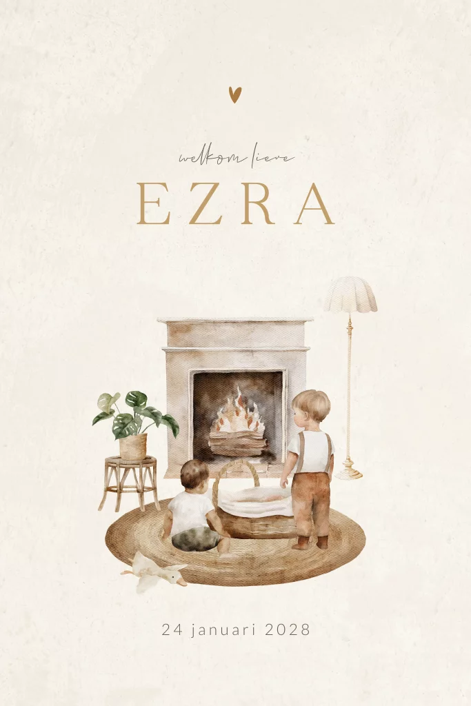 Dit geboortekaartje met aquarel illustraties bevat een lieflijk en huiselijk tafereel van twee kindjes in een woonkamer bij een babymandje. De kindjes zitten lekker warm binnen bij de open haard. Daardoor is dit neutrale geboortekaartje ook zeker geschikt voor baby's die in de winter worden geboren. De warme tinten en het illustratieve design geven het kaartje een warme vintagelook uitstraling.