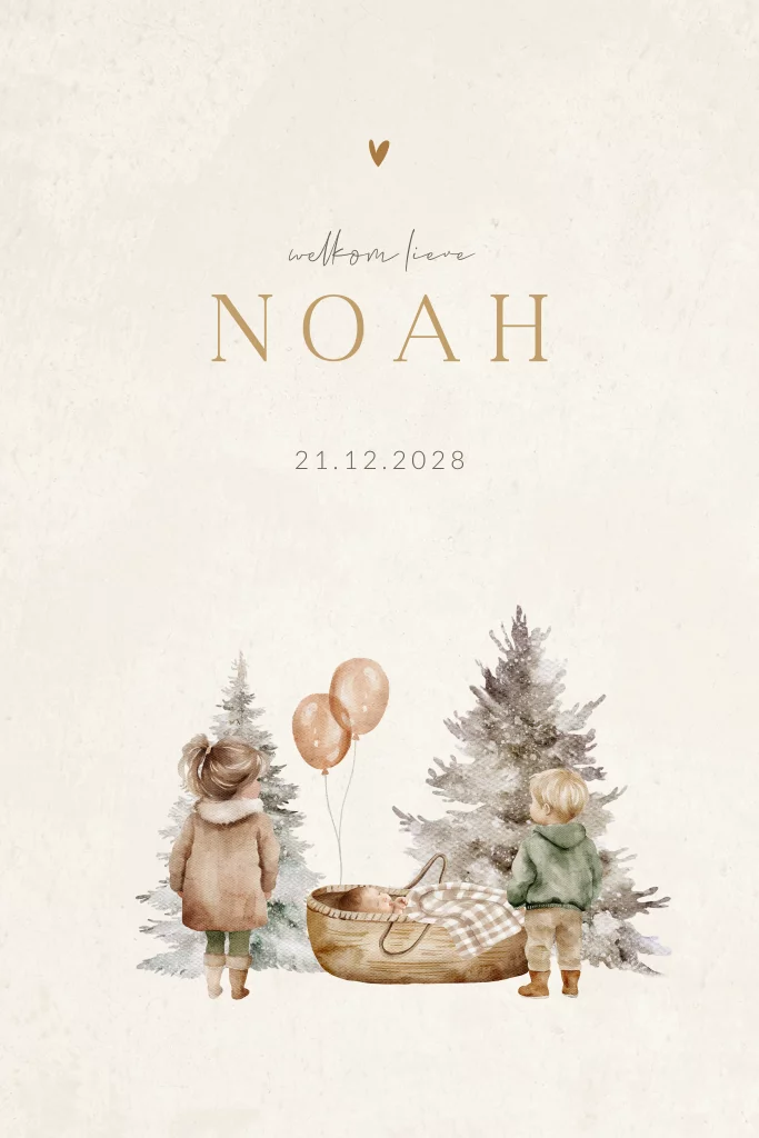 Dit unisex geboortekaartje met een winterse aquarel illustraties bevat een lieflijk tafereel van een grote broer en zus met hun kleine baby broertje of zusje. De baby ligt in een mandje met daaraan ballonnen. Op de achtergrond zie je een winterlandschap van winterse dennenbomen. Dit neutrale geboortekaartje Noah is perfect voor ouders die op zoek zijn naar een uniek geboortekaartje voor hun derde kindje die in de winter geboren wordt.