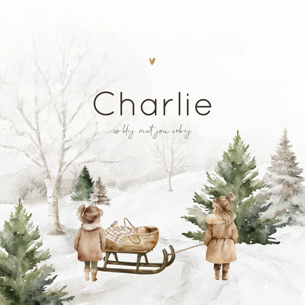 Dit prachtige winterse unisex Charlie geboortekaartje is geschikt voor zowel een jongen als een meisje. Je ziet op het geboortekaartje een prachtig winters landschap met verschillende dennenbomen. Je ziet twee zussen rondom de slee staan en naar hun baby broertje of zusje kijken die in de mand op de slee ligt. Op de rieten mand zit een vogeltje naar de baby te kijken. Dit geboortekaartje Charlie is voor een derde kindje, voor een zoon of dochter.