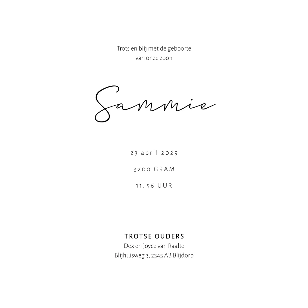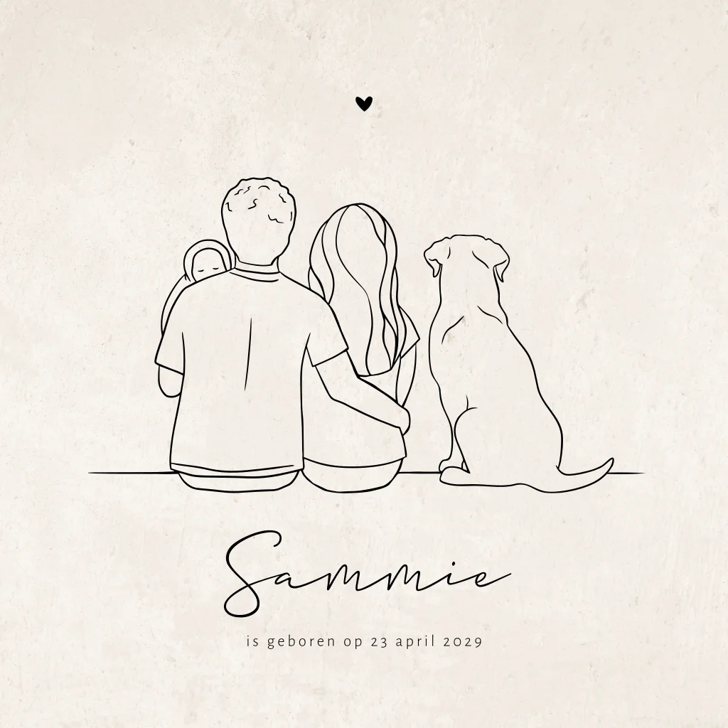Basic geboortekaartje met een lijntekening van een gezin: papa, mama, baby en een labrador hond. De achtergrond van dit kaartje Sammie is beige van kleur met een betonlook. Pas de kleuren, lettertypes en afbeelding zelf aan in onze online editor. De ronde hoeken van deze kaart geven een speels effect.