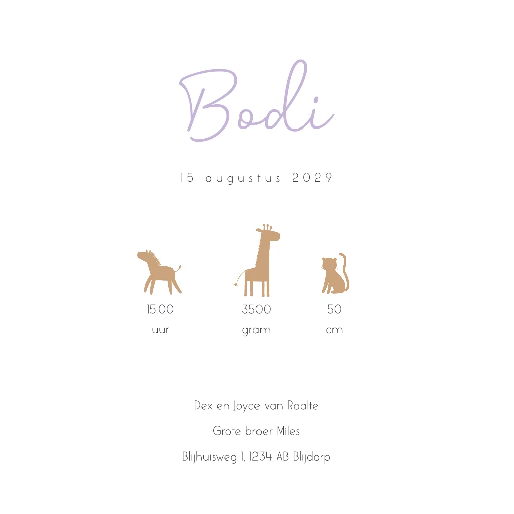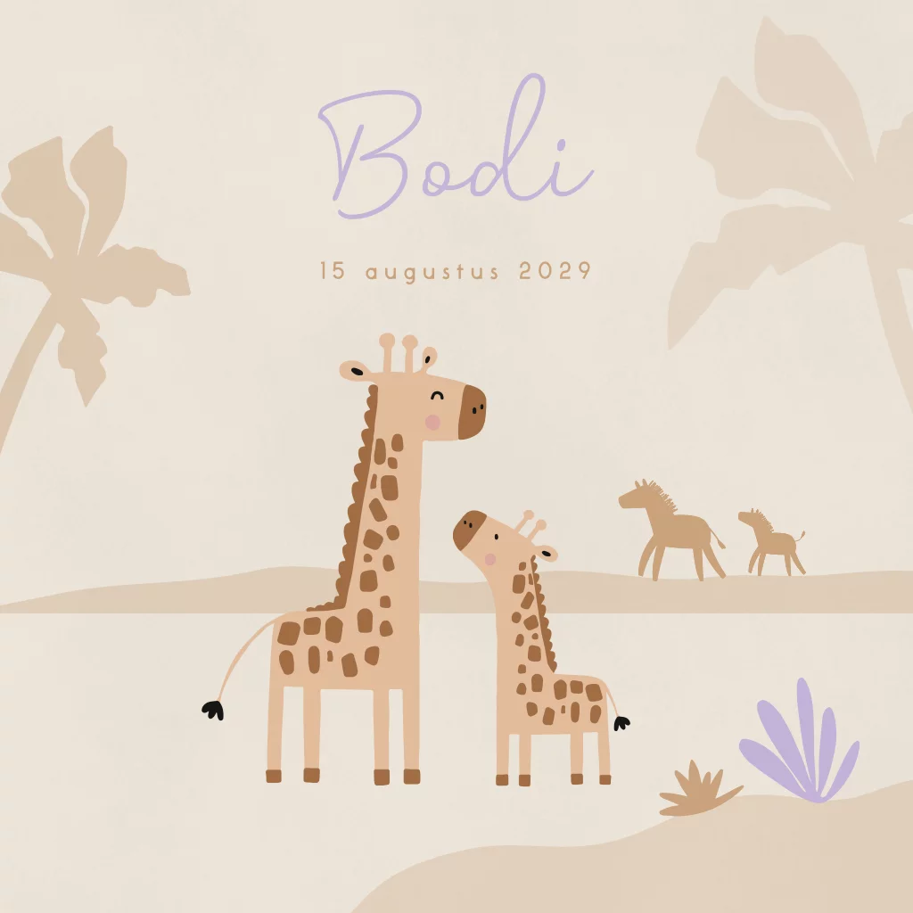 Hip unisex geboortekaartje in safari thema met giraffen en palmbomen. Op de achtergrond staan ook nog 2 zebra's. Dit geboortekaartje Bodi heeft beige kleurige achtergrond met lila accenten, een mooie combinatie! Pas het kaartje makkelijk zelf aan in de online editor. Gebaseerd op het geboortekaartje van Maeve - Joyce Verwaayen.