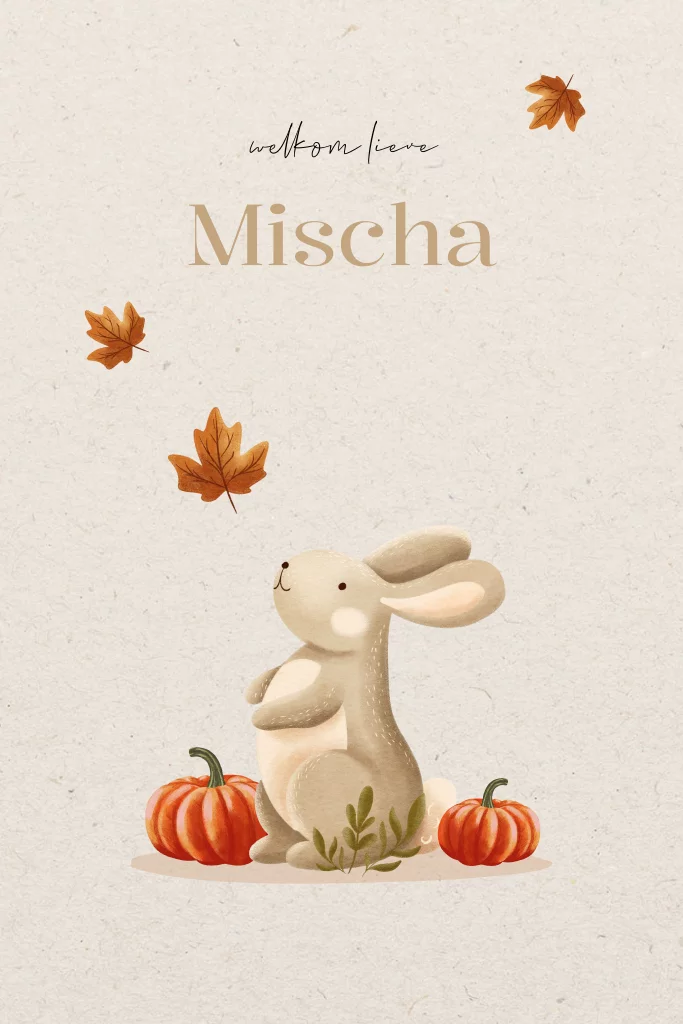 Verwachten jullie een jongen of meisje in de herfst? Daar past dit genderneutrale geboortekaartje Mischa perfect bij. Je ziet een konijn met herfstbladeren en pompoenen. Dit geboortekaartje heeft een rustig design met afgeronde hoeken. Het gehele kaartje is naar eigen wens aan te passen in onze online editor. Maak dit unisex kaartje voor jullie zoon of dochter helemaal af met een roestbruine envelop.