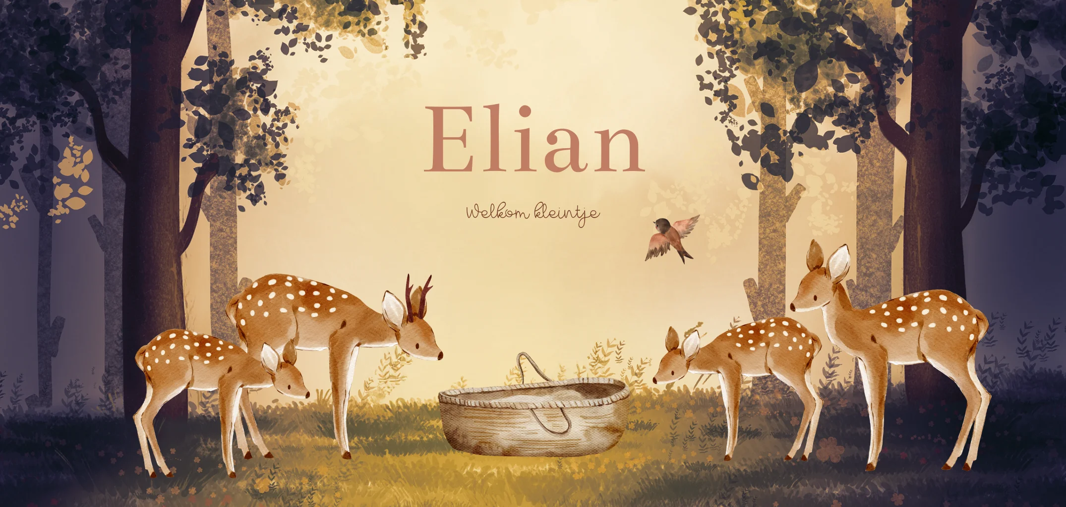 Unisex geboortekaartje voor een jongen of een meisje. Op dit geboortekaartje Elian zie je een rieten mand met baby in het bos. Om het babymandje staan nieuwsgierige hertjes te kijken. Het kaartje heeft rustige bruine tinten waardoor dit kaartje ook zeker geschikt is voor een herfst baby. Pas het kaartje eenvoudig aan in de editor. Hulp nodig? Wij helpen je graag verder.