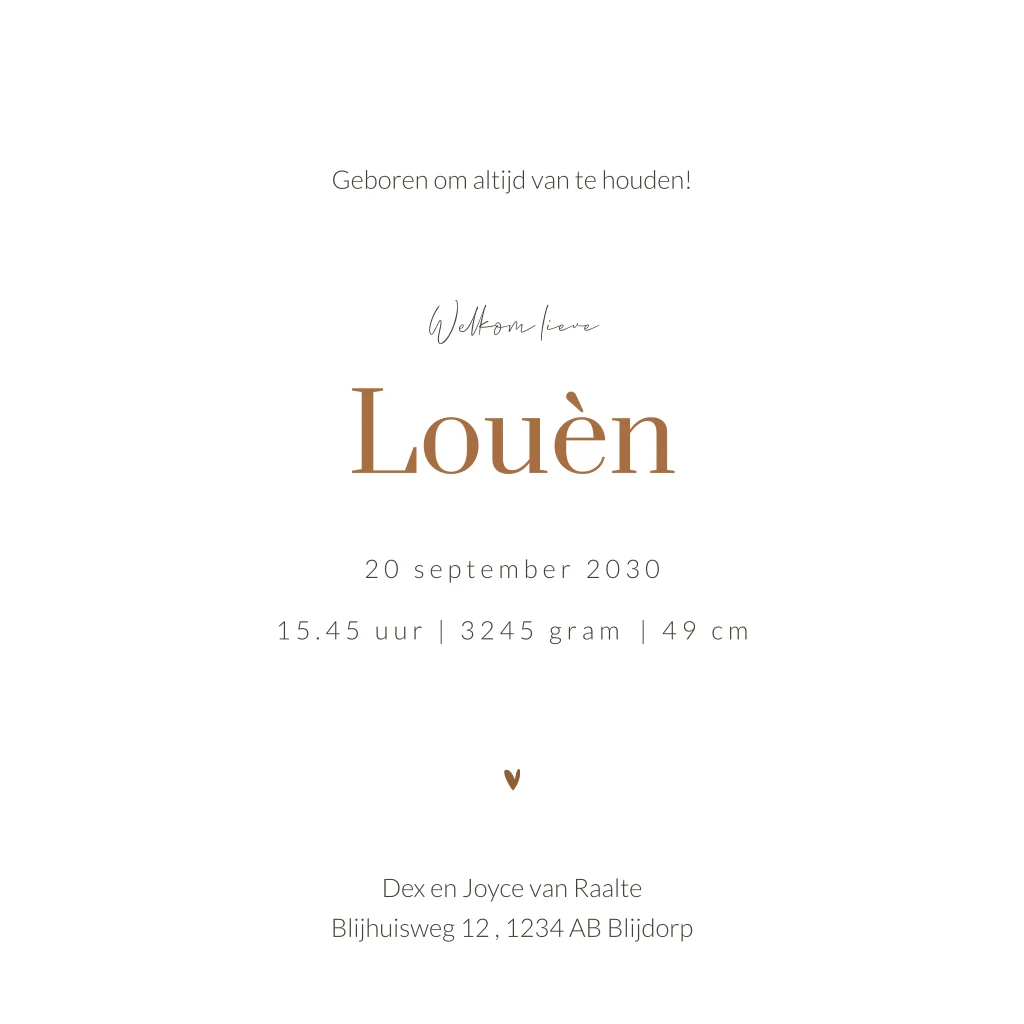Lief unisex geboortekaartje voor een jongen of meisje. Op dit geboortekaartje Louèn zie je een natuurlijk landschap met waterval, boom en een lief hertje. Door de neutrale kleuren en elementen is dit geboortekaartje geschikt voor zowel een zoon of dochter. Je kunt de kaart naar je eigen wensen aanpassen in de editor. Hulp nodig bij het ontwerpen? Neem contact met ons op!