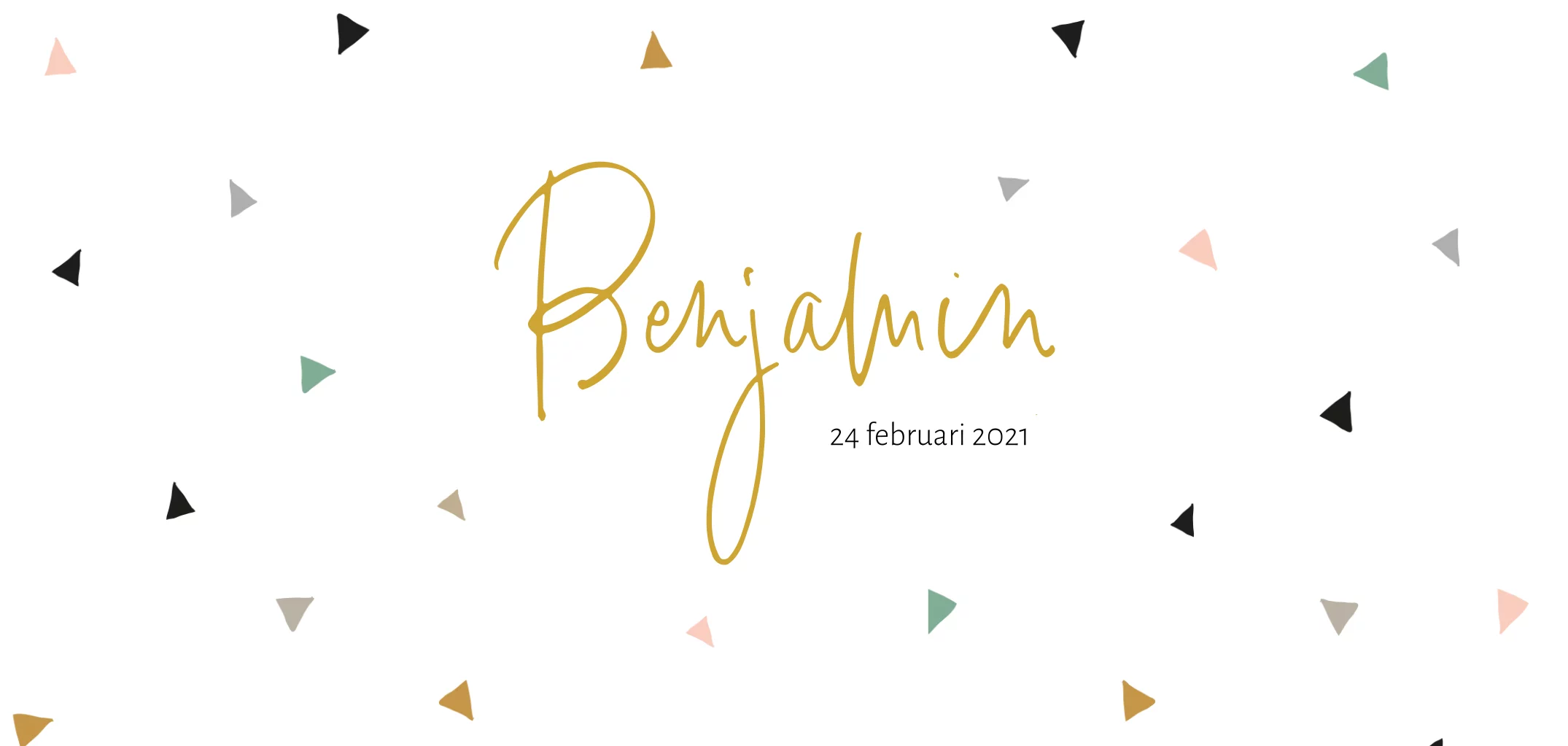 Lief rustig geboortekaartje voor zowel een jongen als een meisje. Op de voorzijde van deze gender neutrale kaart staat een hip gekleurd driehoekjes patroon. De babynaam staat in sierlijke letters.