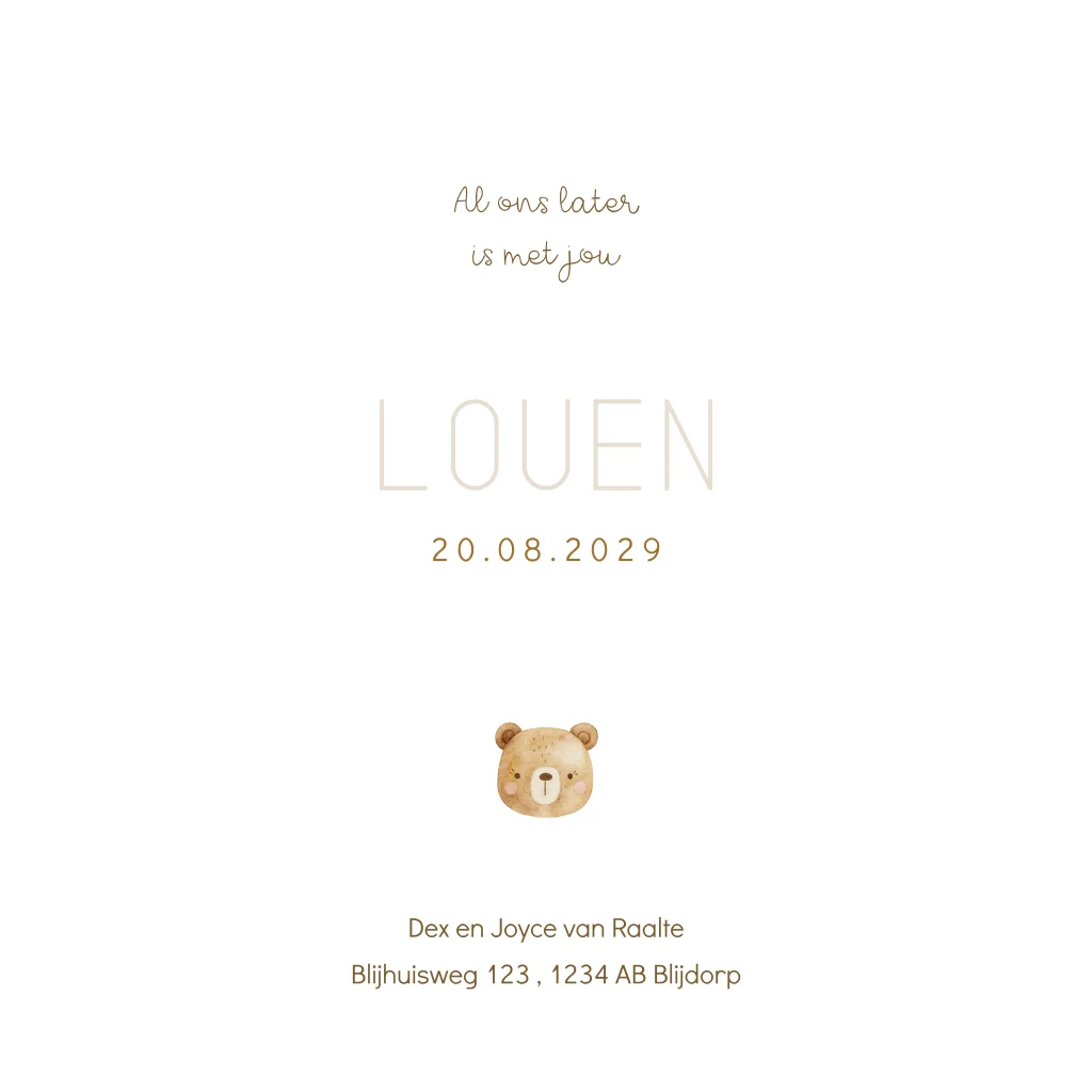 Basic unisex geboortekaartje, geschikt voor zowel een jongens als meisje. Op dit genderneutrale geboortekaartje Louen een lief beertje. Dit babykaartje heeft een rustige uitstraling en kun je naar je eigen smaak aanpassen in de editor. Hulp nodig? Wij helpen je graag!