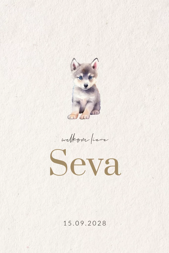 Lief unisex geboortekaartje voor zowel een jongen als een meisje. Op dit geboortekaartje Seva zie je een schattige illustratie van een wolvenwelpje. De oude papierenlook achtergrond en afgeronde hoeken maken van dit rustige geboortekaartje een prachtig ontwerp. Pas dit geboortekaartje naar eigen wens aan in onze online editor en maak het kaartje voor jullie zoon of dochter helemaal af met de bijpassende sluitzegel.