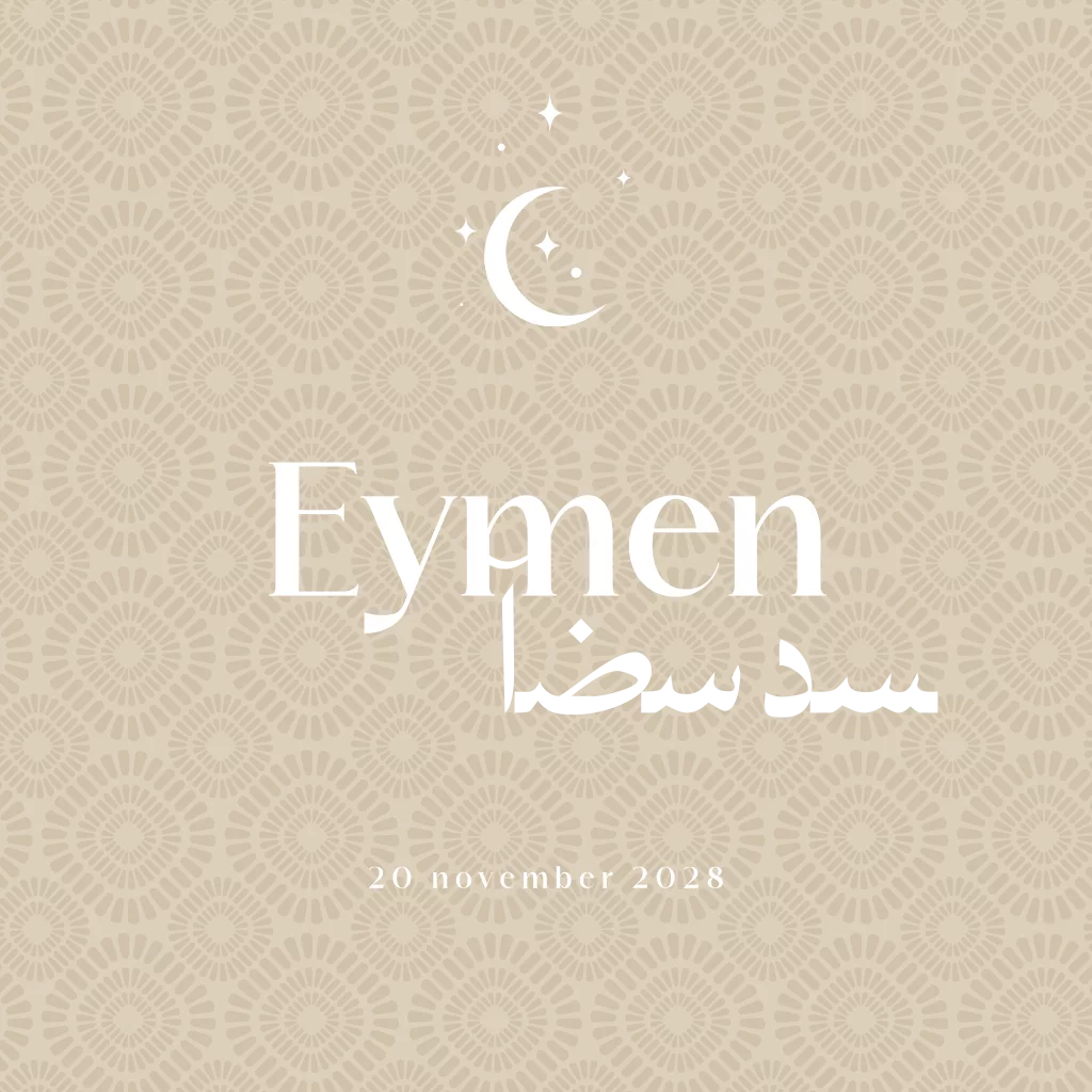 Dit islamitische geboortekaartje is een prachtig geïllustreerd unisex kaartje dat perfect is voor zowel jongens als meisjes. Het unieke ontwerp, met een oosters patroon en maan en sterren, straalt stijl en elegantie uit. De toevoeging van foliedruk zorgt voor een luxe uitstraling en maakt dit kaartje extra bijzonder.