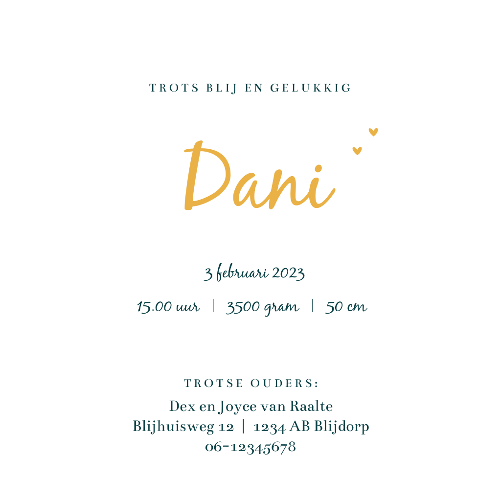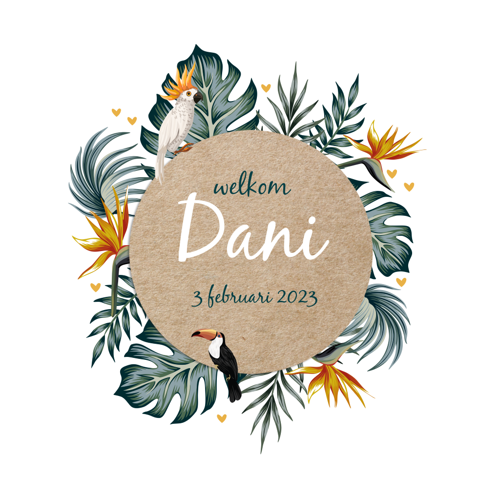 Jungle geboortekaartje dat zowel voor een jongen als een meisje te gebruiken is, oftewel unisex. Op dit kaartje staat een cirkel van karton waarop de babynaam Dani staat. Om de cirkel heen staan verschillende botanische bladeren, tropische bloemen, een toekan, kaketoe en kleine hartjes. Op de binnenzijde is ruimte om een foto toe te voegen.