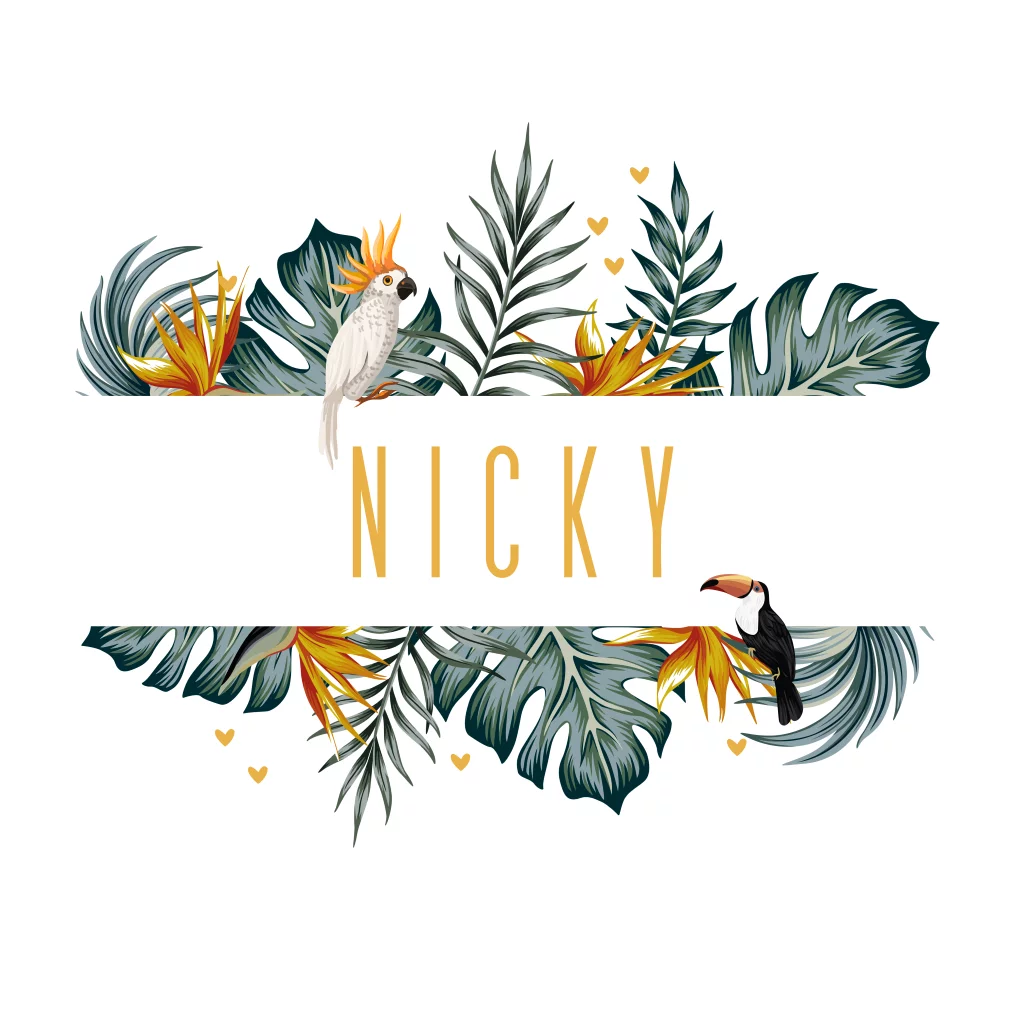 Botanisch gender neutraal geboortekaartje dat geschikt is voor zowel een jongen als een meisje, oftewel unisex. Op dit kaartje Nicky staan tropische vogels, een toekan en een kaketoe en verschillende botanische bladeren. Pas de kleuren en lettertypes naar wens aan in de editor.