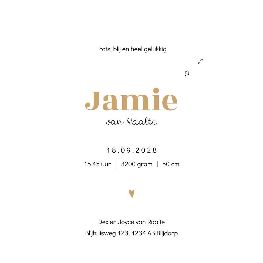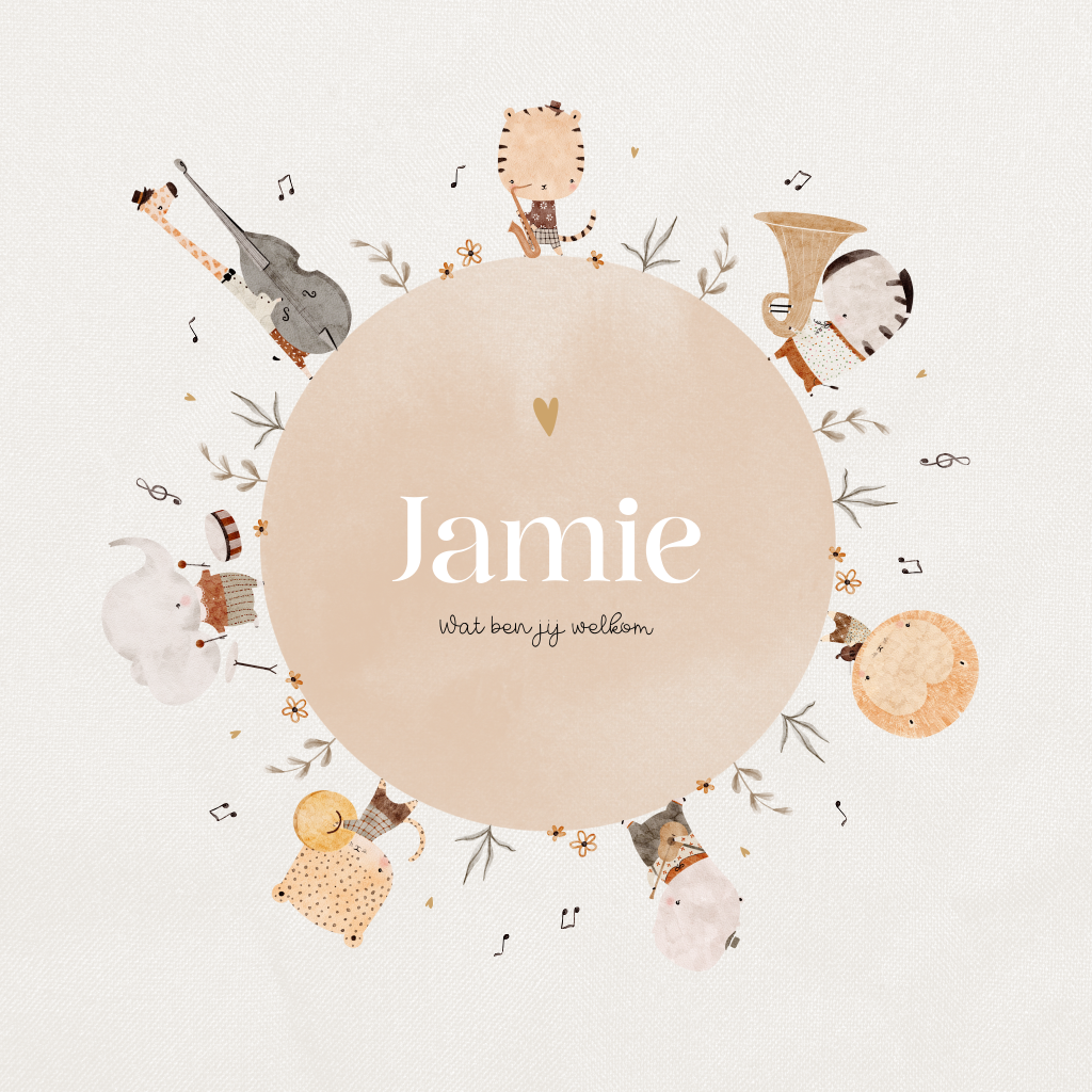 Vrolijk jungle dieren geboortekaartje. Dit mooie geboortekaartje met dieren is perfect voor een zoon of dochter. Het kaartje is voorzien van een wereldbol met daaromheen allerlei dieren waaronder een olifant, giraffe en leeuwtje. De dieren bespelen muziekinstrumenten waaronder een trommel, trompet en viool. De muzieknootjes en hartjes maken dit vrolijke en schattige geboortekaartje Jamie helemaal compleet.