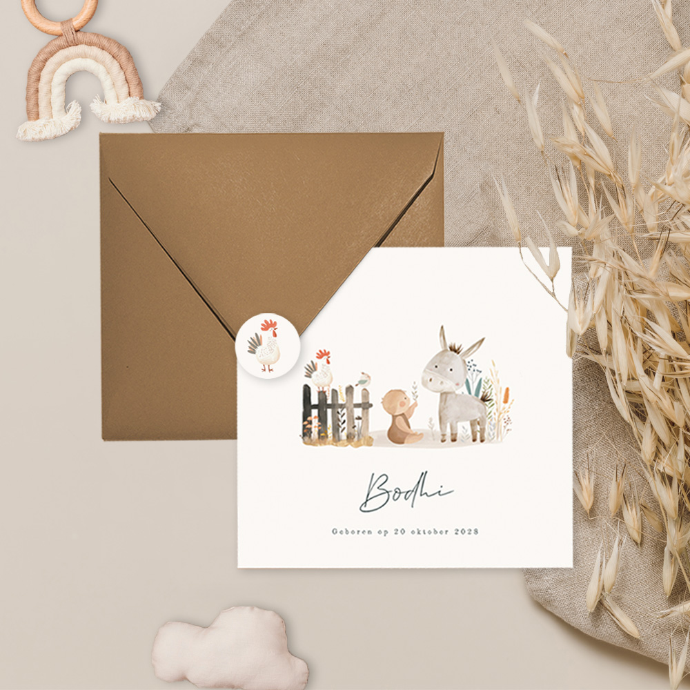 Dit prachtige unisex geboortekaartje met een aquarel illustratie van een schattige baby met ezel en kippen is perfect voor de aankondiging van je zoon of dochter. Dit geboortekaartje Bodhi is genderneutraal en daardoor geschikt voor zowel een jongen als een meisje. Pas de teksten, lettertypes en kleuren eenvoudig aan in de editor. Hulp nodig bij het ontwerpen? Neem contact met ons op!