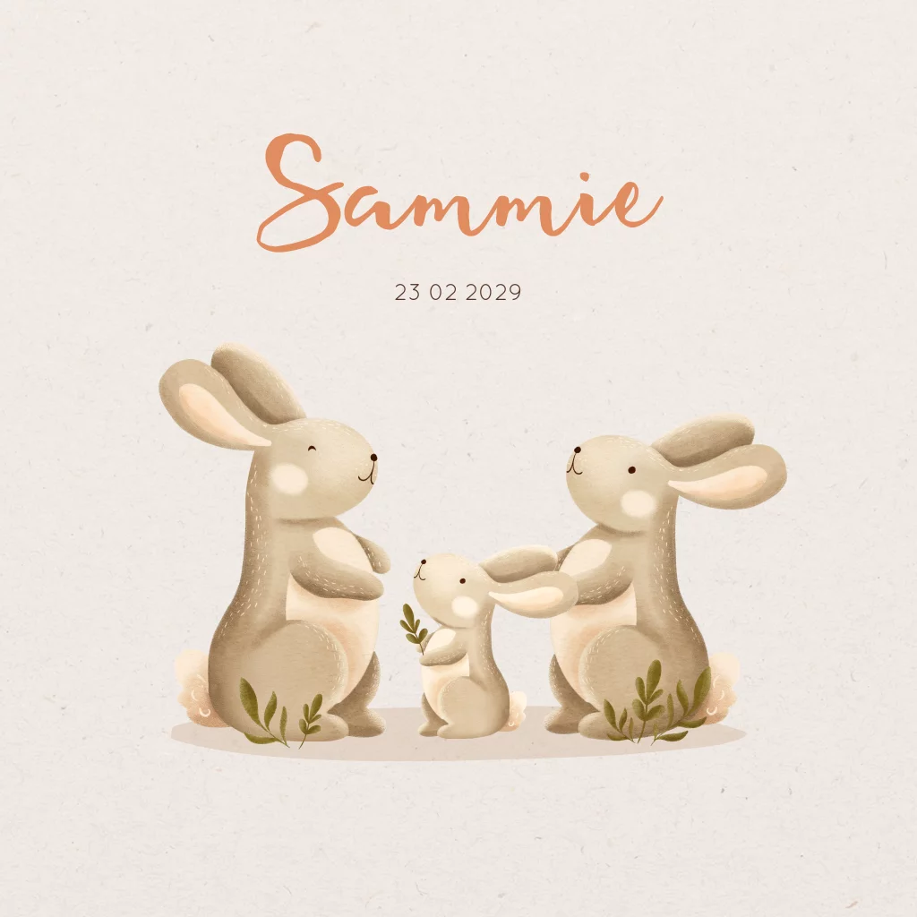 Lief geboortekaartje Sammie met een konijnen gezin. Het kaartje heeft neutrale kleuren waardoor deze unisex is en zowel geschikt is voor een jongen als een meisje. De lettertypes en kleuren zijn naar je eigen smaak aan te passen. Extra handig: Laat de geboortekaartjes met onze verzendservice direct vanaf de drukkerij versturen. Vragen of wensen? Laat het gerust weten, wij helpen je graag.