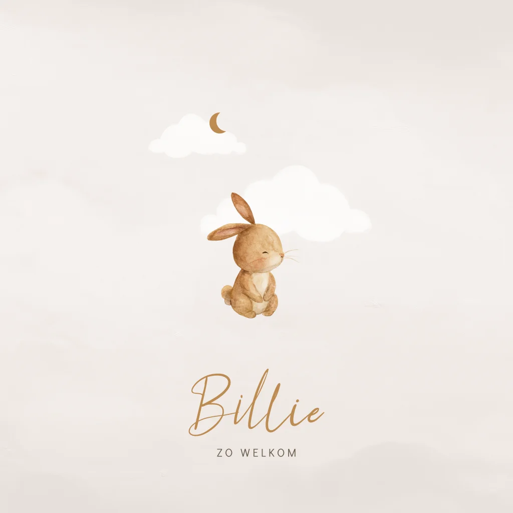 Unisex geboortekaartje met een lief konijntje. Op de achtergrond van dit geboortekaartje zie je wolken en de maan. Dit geboortekaartje Billie heeft rustige beige bruine kleuren en is daardoor genderneutraal en geschikt voor een jongen en meisje. Het geboortekaartje is rustig en lief tegelijk. Kleuren en afbeeldingen pas je eenvoudig aan in de editor. Bestel vandaag nog jouw perfecte geboortekaartje bij Blijkaartje.nl!