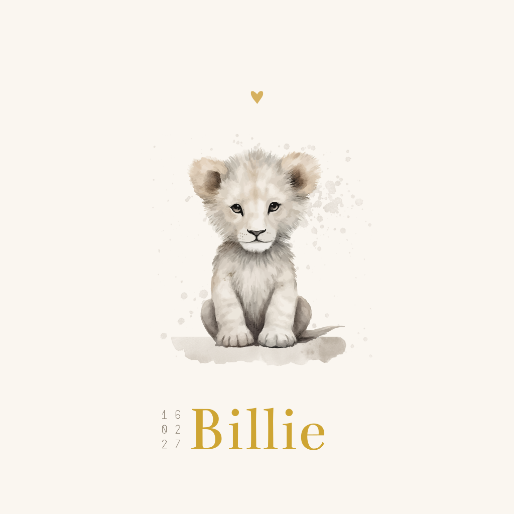 Rustig neutraal geboortekaartje voor zowel een jongen als een meisje met een beige achtergrond en ronde hoeken. Op dit geboortekaartje Billie zie je een aquarel illustratie van een lief leeuwen welpje met spetters en hartje. De ronde hoeken maken dit unisex babykaartje extra speciaal. Pas de teksten, kleuren en lettertypes naar je eigen smaak aan in de editor.