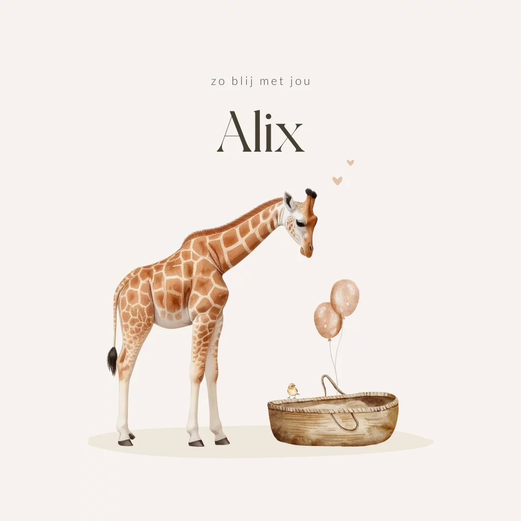 Of jullie nu een zoon of dochter verwachten, dit unisex geboortekaartje is een prachtige keuze om de komst van jullie kindje aan te kondigen. Op dit geboortekaartje Alix zie je een giraffe bij een wiegje staan. Aan de wieg hangen ballonnen en zit een schattig vogeltje.