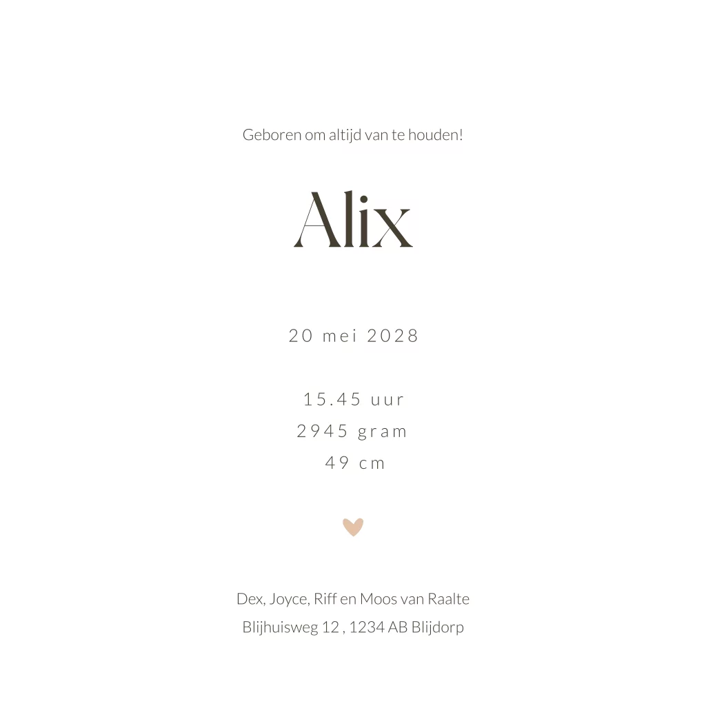 De neutrale kleuren maken dit kaartje geschikt voor zowel een jongen als een meisje. In de online editor kun je dit kaartje naar eigen wens aanpassen voor jullie zoon of dochter.