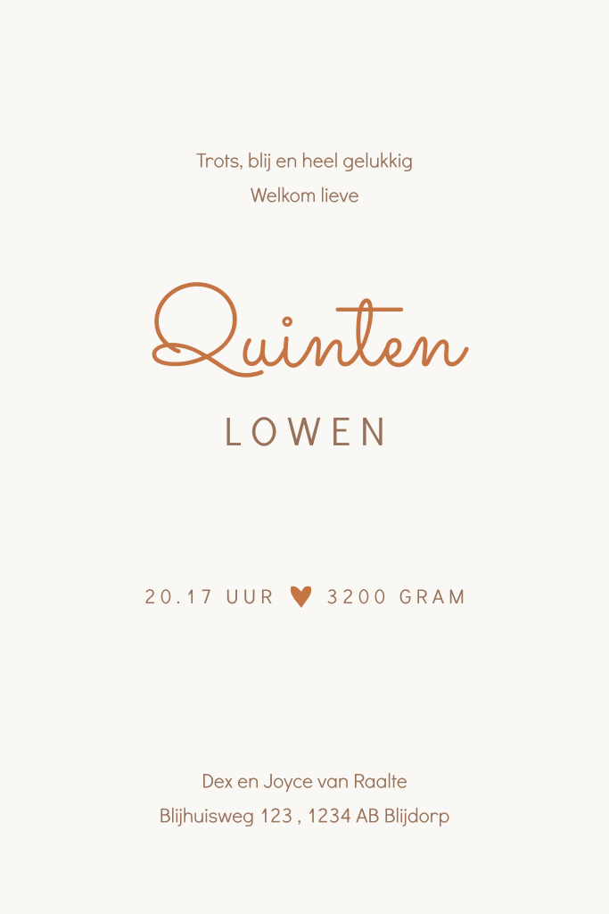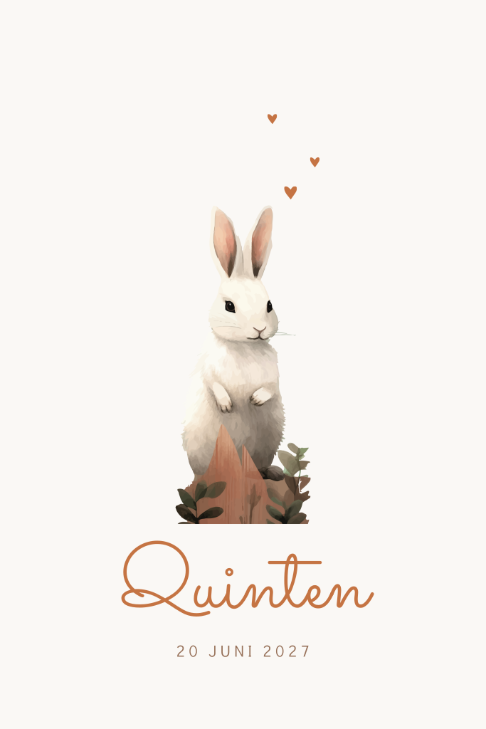 Lief unisex geboortekaartje voor de geboorte van jullie zoon of dochter. Op dit babykaartje Quinten een lief konijntje met hartjes op de achtergrond. Het kaartje oogt neutraal en is daardoor helemaal geschikt voor zowel een jongen als een meisje. Pas de kleuren, teksten en lettertypes eenvoudig aan in de editor. Hulp nodig? Wij helpen je graag!