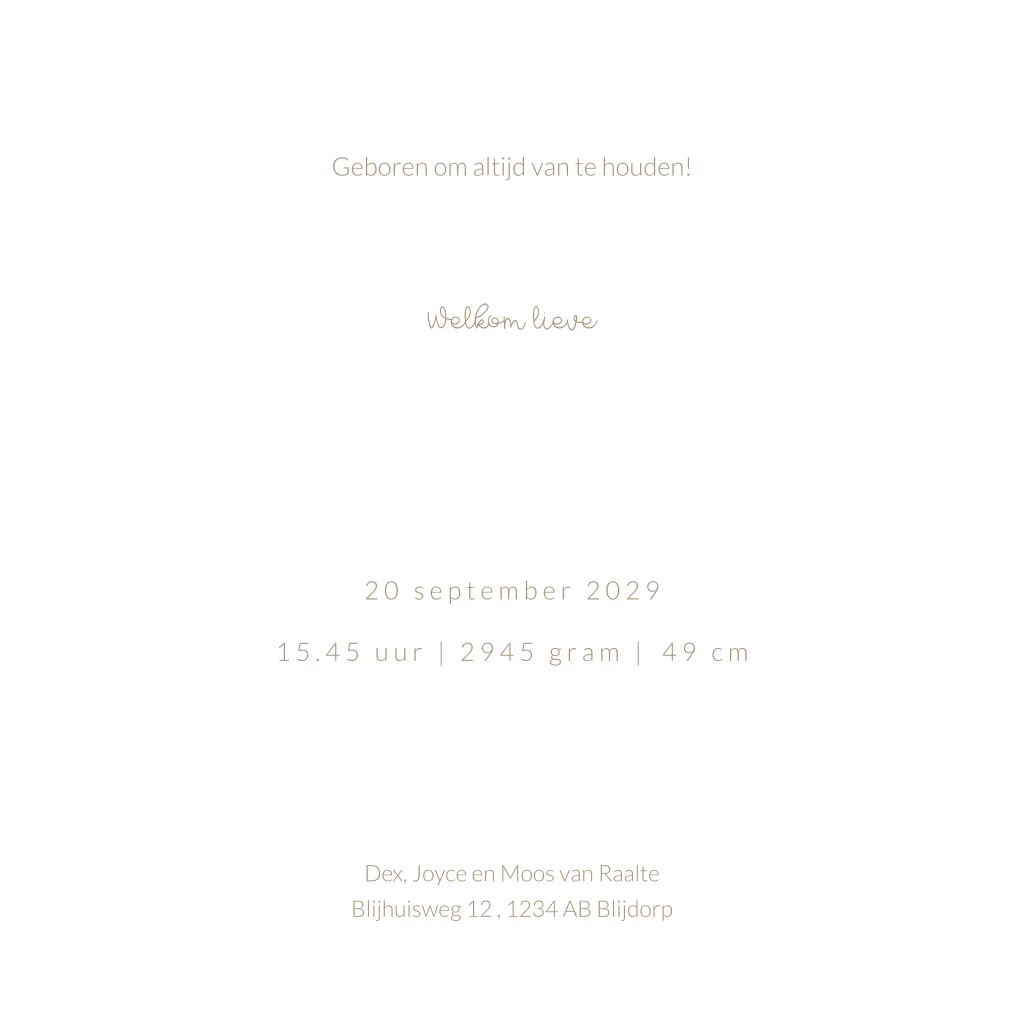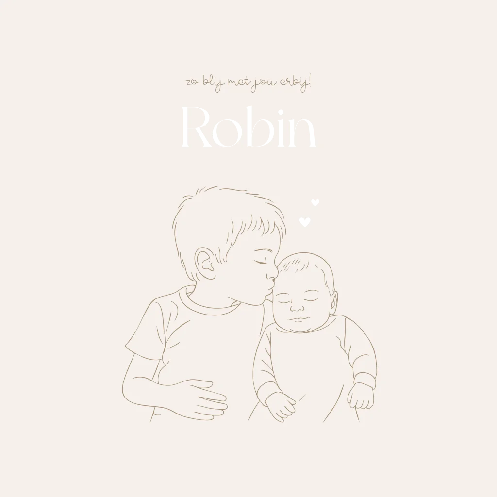 Een prachtig unisex geboortekaartje voor een tweede kindje, een jongen of meisje. Dit kaartje Robin heeft een stijlvolle lijntekening van twee kindjes. Je ziet op de lijntekening een grote broer met zijn kleine broertje of zusje. De grote broer geeft een kus aan de baby. De beige achtergrond en bruine kleurtinten zorgen voor een rustig design. De goudfolie geeft net dat beetje extra aan dit geboortekaartje. Wil je graag een lijntekening op maat voor jullie zoon of dochter? Stuur ons gerust een berichtje!
