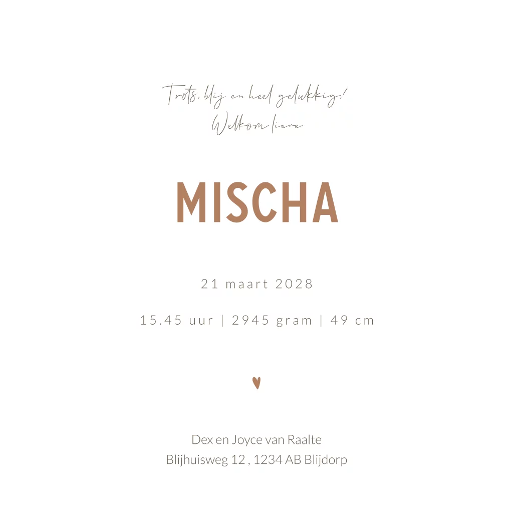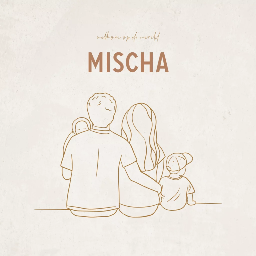 Dit prachtige unisex geboortekaartje Mischa is perfect voor de aankondiging van de geboorte van jullie zoon of dochter. Met een mooie lijntekening van een papa, mama, grote broer en baby straalt het kaartje rust uit. Of jullie nu een jongen of een meisje verwachten, dit kaartje is voor beide geschikt. De envelop in de roestbruine kleur voegt een extra speciaal tintje toe aan dit prachtige kaartje voor jullie tweede kindje. Pas dit geboortekaartje naar eigen wens aan in de online editor.