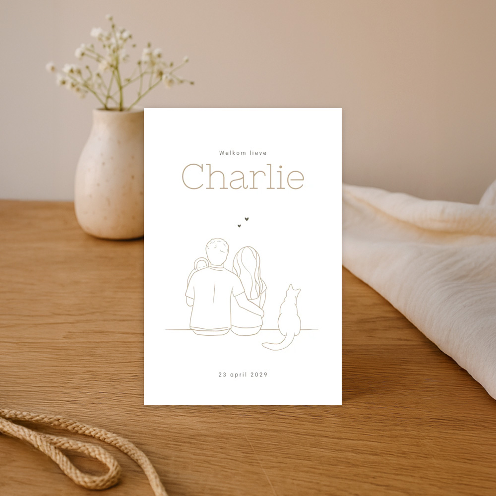 Stijlvol en rustig geboortekaartje met een lijntekening van een gezin: papa, mama, baby en kat. Boven het gezin staan een aantal hartjes. De achtergrond van dit kaartje Charlie is wit en de lijntekening heeft een bruintint. Pas de kleuren, teksten en lettertypes van dit unisex geboortekaartje zelf eenvoudig aan in onze online editor.