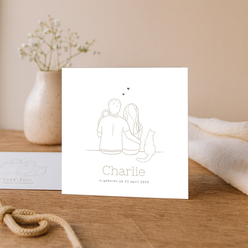 Basic geboortekaartje met een lijntekening van een gezin; papa, mama. baby en de kat. Boven het gezin staan een aantal hartjes. De achtergrond van dit kaartje Charlie is wit en de lijntekening heeft een bruintint. Pas de kleuren, lettertypes en afbeelding zelf aan in onze online editor.