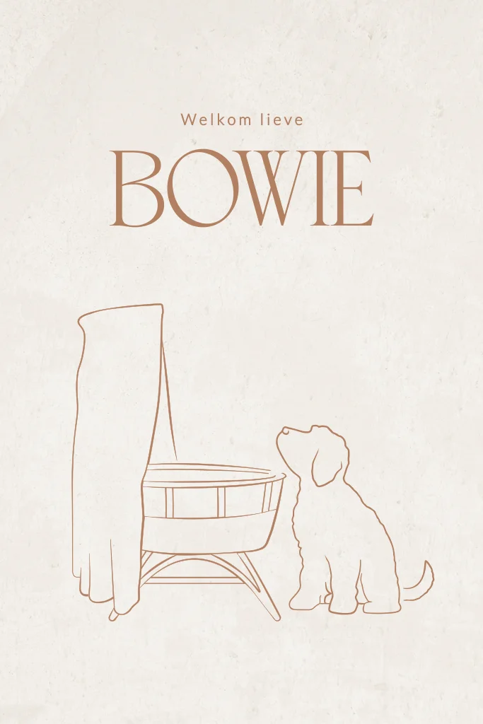 Genderneutraal geboortekaartje in neutrale kleuren voor een jongen of een meisje. Op dit geboortekaartje Bowie staat een prachtige lijntekening van een labradoodle hond bij de hond van zijn nieuwe vriendje of vriendinnetje, jullie pasgeboren baby! Helemaal leuk om jullie huisdier te betrekken bij het geboortekaartje. Pas de teksten, kleuren en lettertypes naar je eigen smaak aan in de editor. Ook kun je zelf bepalen of je ronde hoeken wilt.
