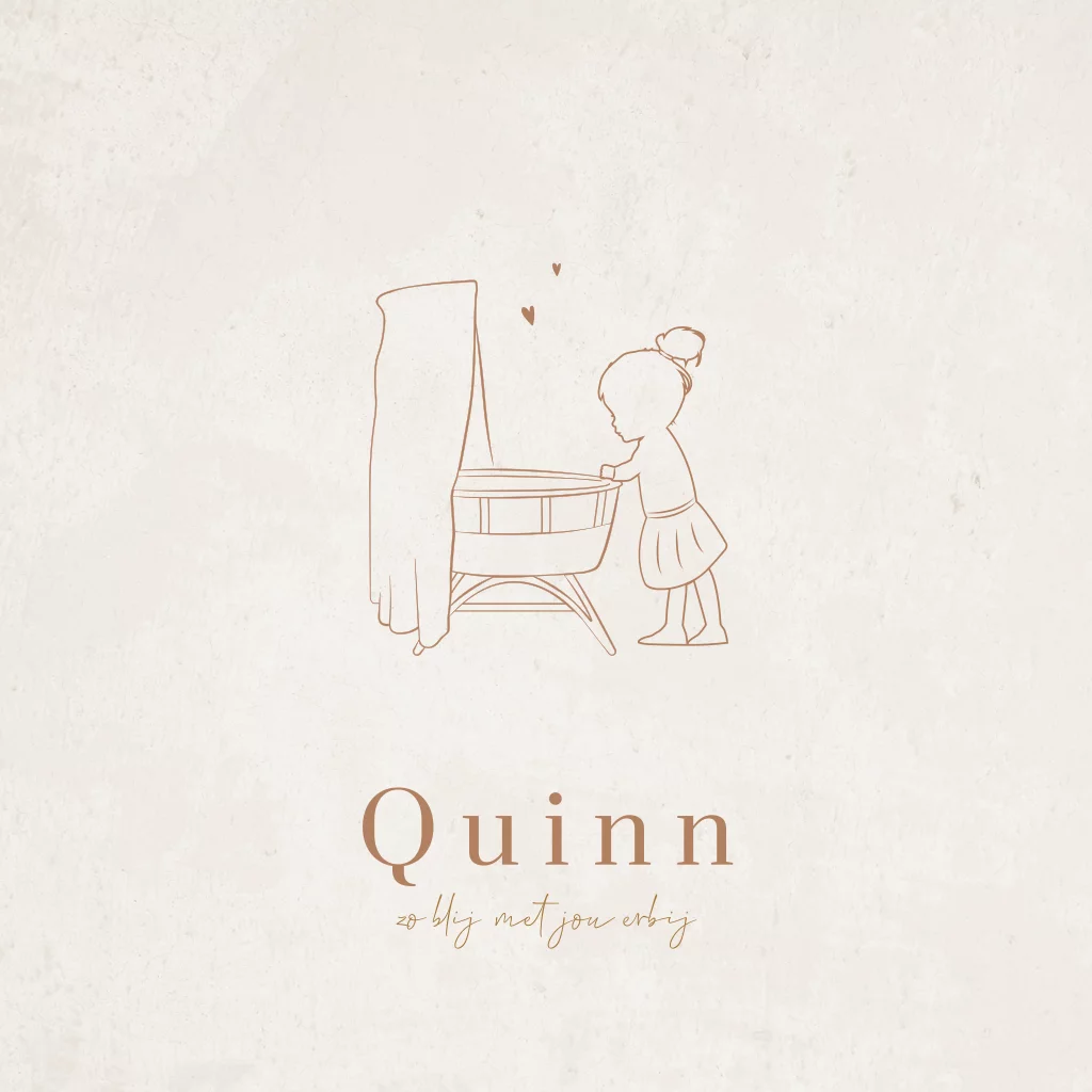 Dit prachtige unisex geboortekaartje met een minimalistische lijntekening is perfect voor de aankondiging van de geboorte van jullie tweede kindje. De unieke illustratie van een grote zus bij de wieg van haar broertje of zusje geeft een rustige uitstraling aan het kaartje. Of jullie nu een zoon of dochter hebben gekregen, dit kaartje is geschikt voor beide en straalt een warme sfeer uit.