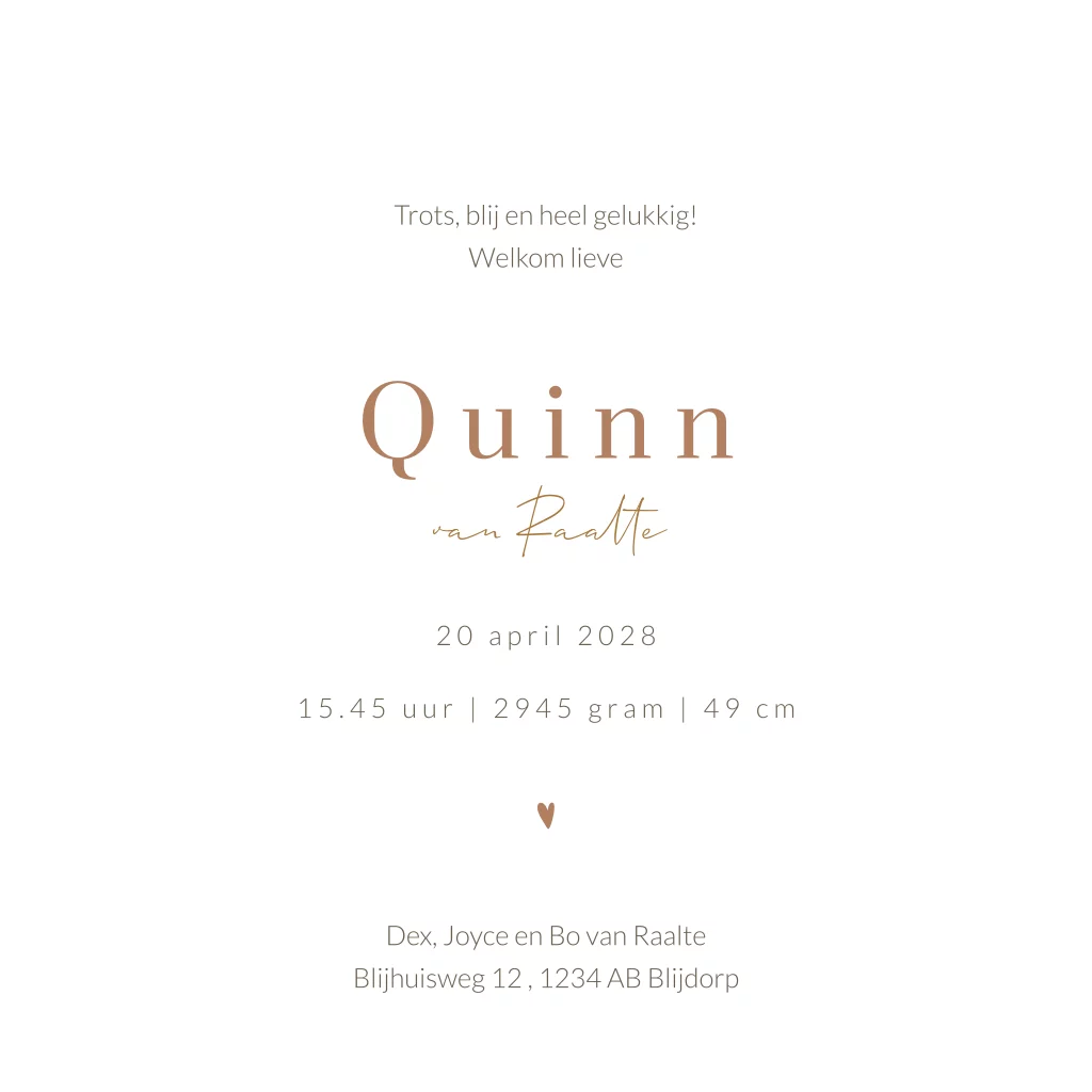 Je kunt dit geboortekaartje Quinn naar je eigen wensen aanpassen in de editor. Hulp nodig bij het ontwerpen? Neem contact met ons op!