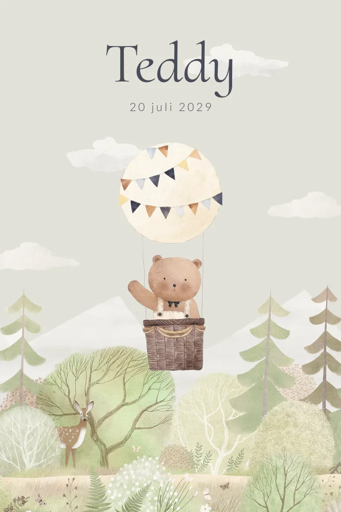 Schattig geïllustreerd geboortekaartje voor een jongen of meisje. Op dit unisex geboortekaartje Teddy zie je een beer in een luchtballon, zwevend boven het bos. Dit geboortekaartje is ideaal voor ouders die op zoek zijn naar een unisex kaartje met een lief en illustratief design. Personaliseer het kaartje met jullie eigen tekst en maak het helemaal af.