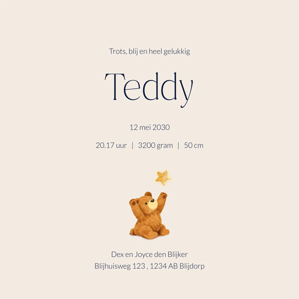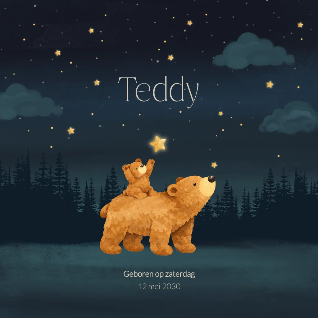 Lief geboortekaartje voor een jongen of meisje. Dit geboortekaartje Teddy heeft een unisex design met een mama beer en haar baby in de nacht onder de sterren. Een magisch geboortekaartje voor een magisch moment, de komst van jullie zoon of dochter! Pas de teksten, kleuren en lettertypes naar je eigen smaak aan in de editor. Bestel van te voren een proefdruk met een sample envelop setje zodat je het kaartje in het echt kan bewonderen.