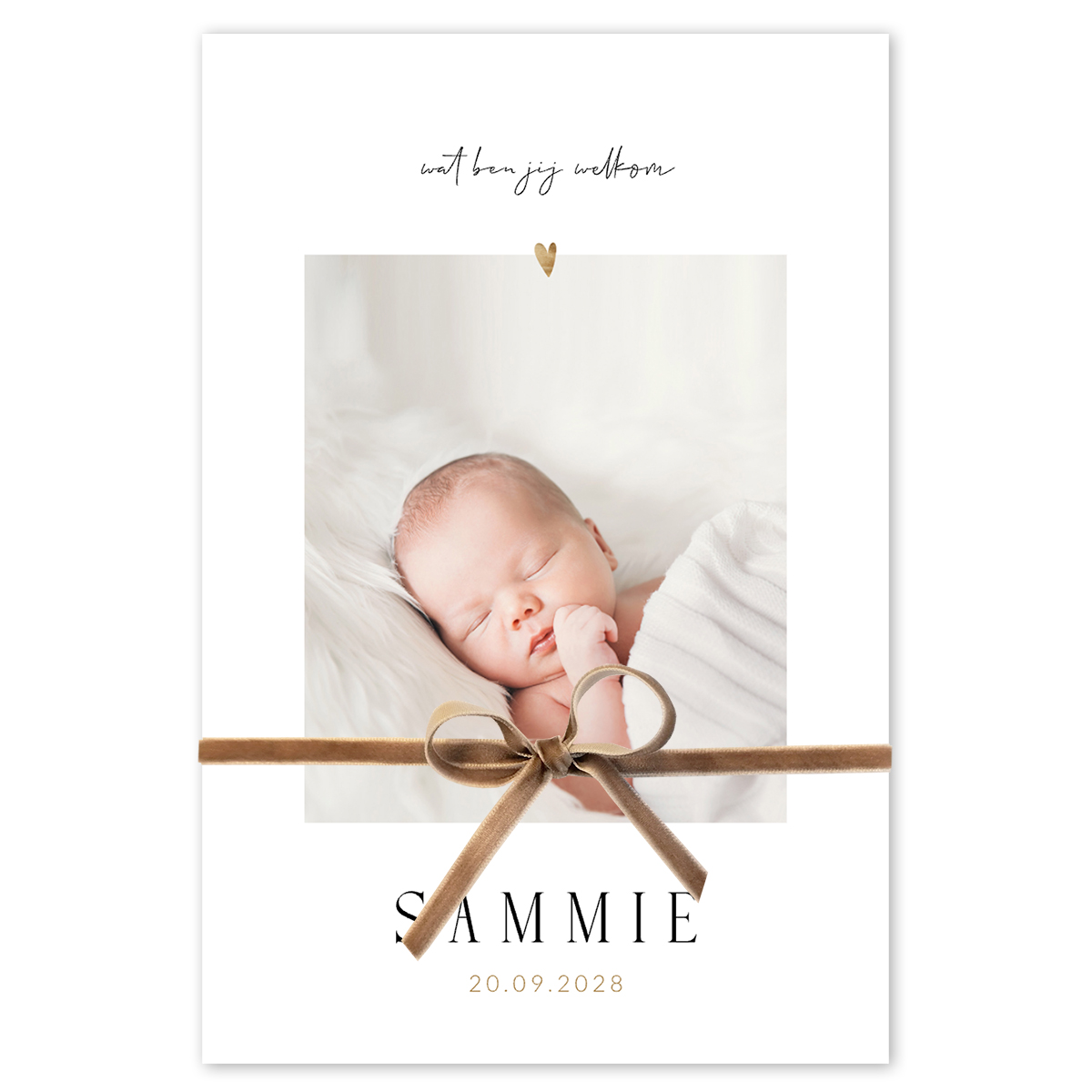 Rustig unisex geboortekaartje voor een jongen of meisje. Dit basic kaartje Sammie is uniek door het fluwelen velours taupe lint waarmee je een strik op de kaart kan maken. Het lintje kun je apart erbij bestellen. Deze wordt niet standaard meegeleverd maar is hier bij te bestellen.