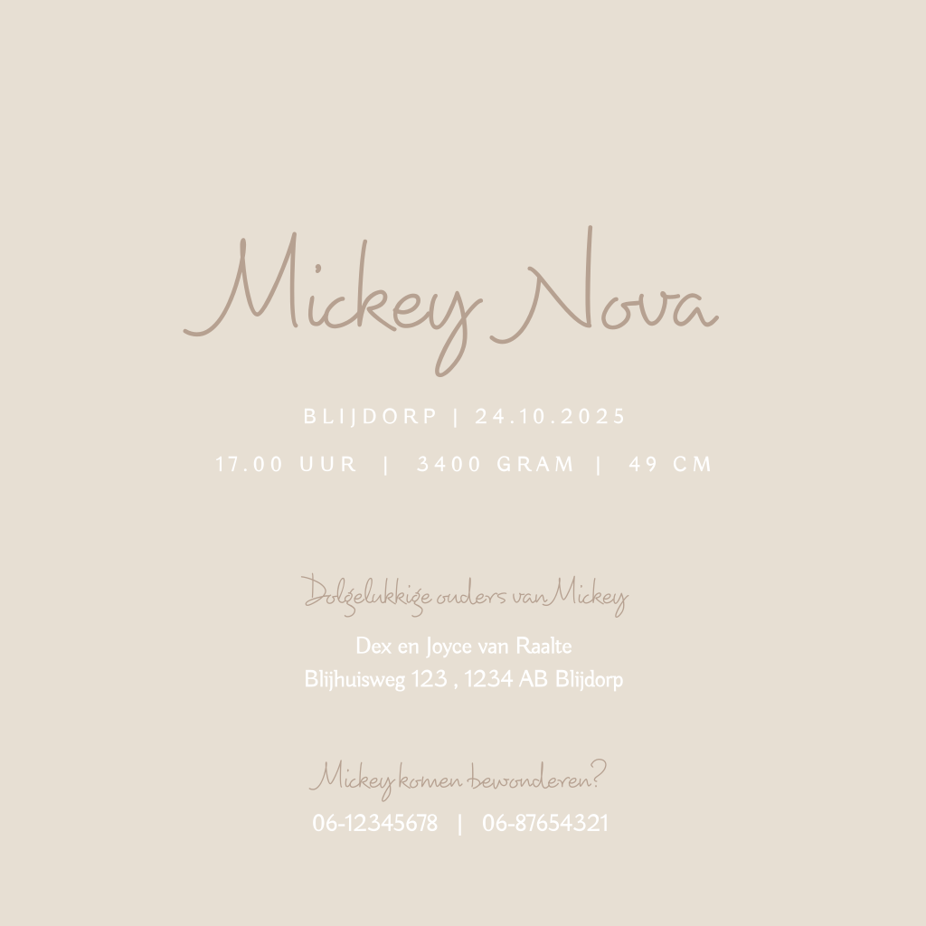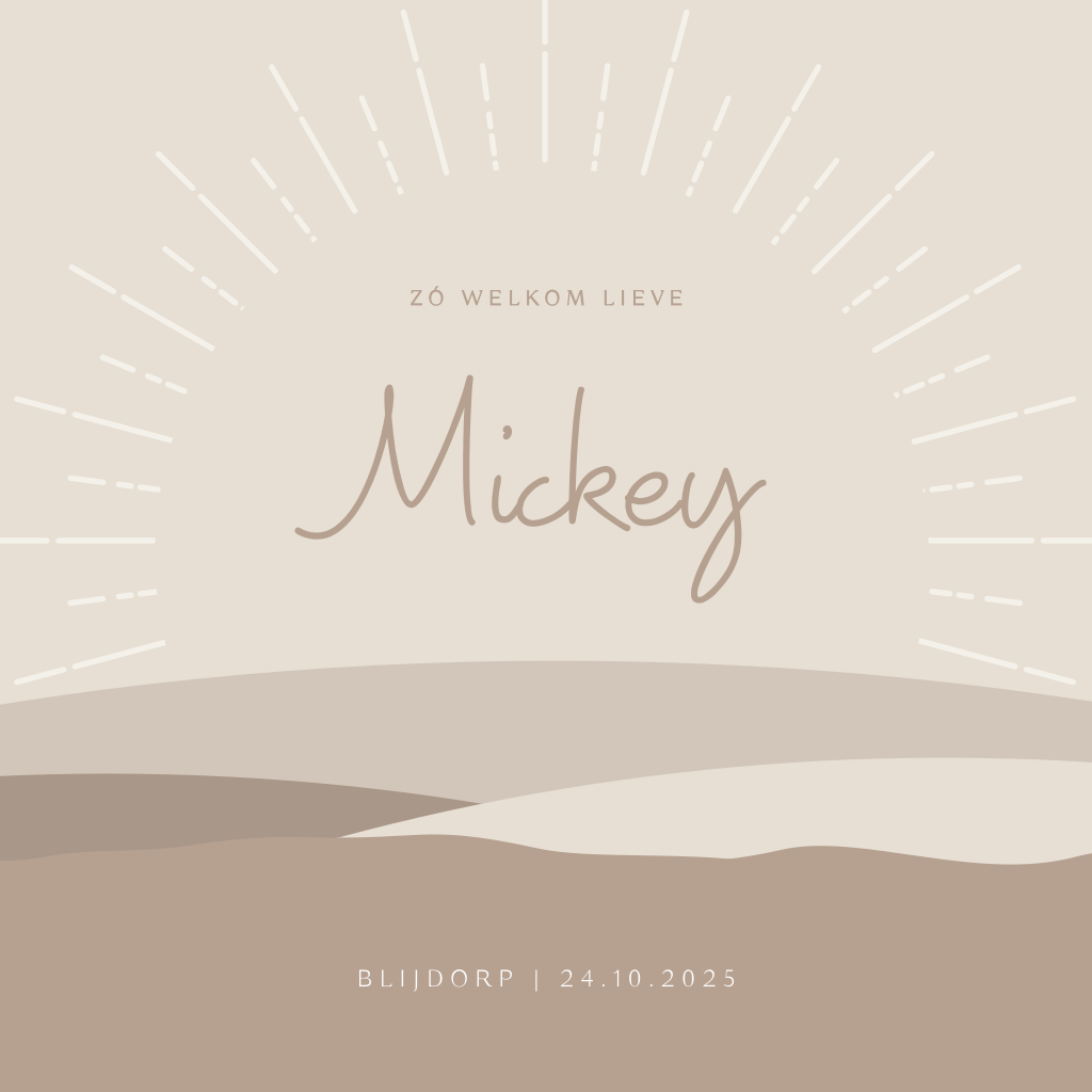 Trendy geboortekaartje voor een jongen of meisje met de babynaam Mickey. Het glooiende landschap en de zonnestralen geven een mooie en vooral rustige sfeer. Het ontwerp en de kleuren maken het kaartje genderneutraal en helemaal van nu. Alle teksten en kleuren zijn naar eigen smaak aan te passen in onze editor. Hulp nodig? Wij helpen je graag verder.