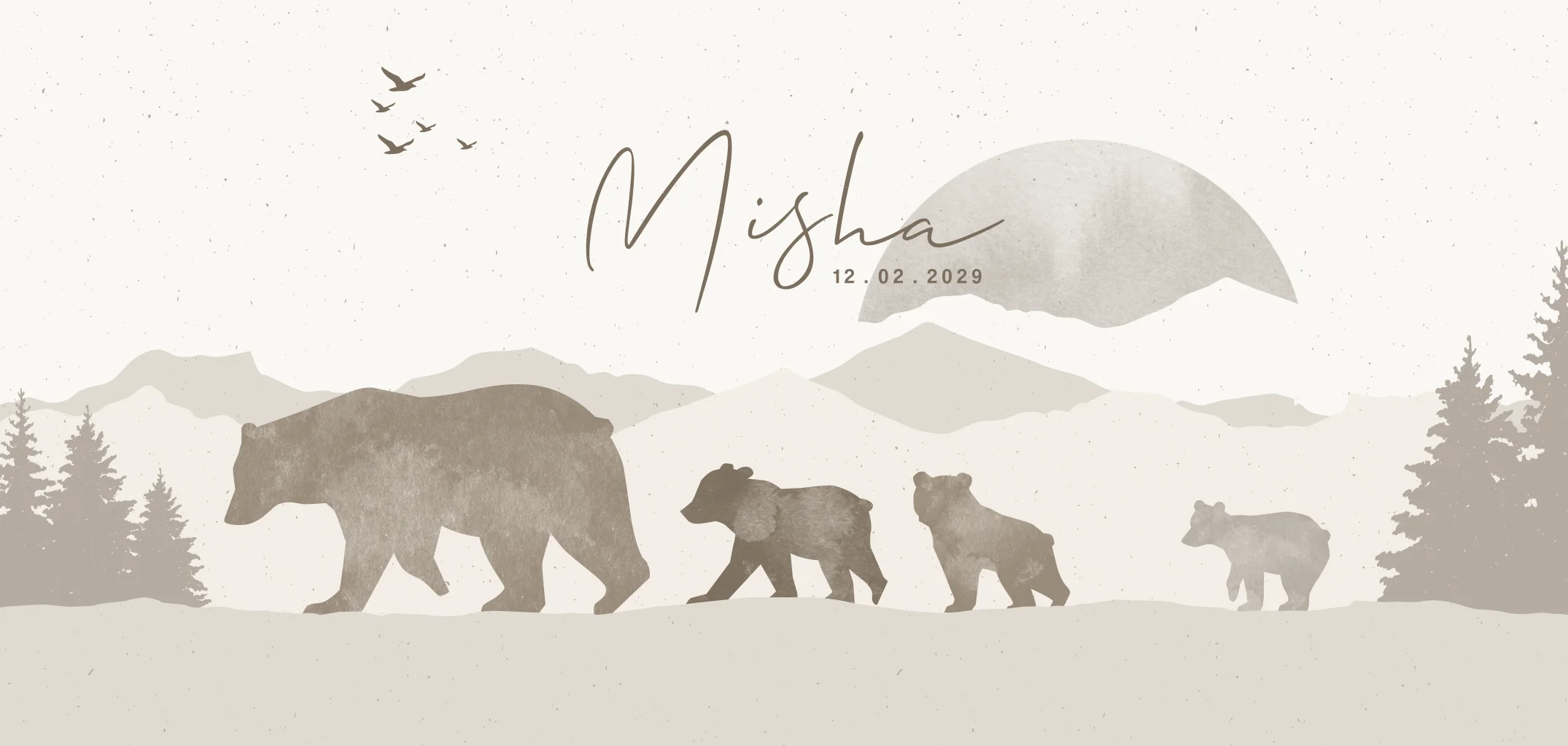 Hip unisex geboortekaartje met bosdieren. Op dit geboortekaartje Misha zie je een beer wandelen met kleine welpjes door een ton sur ton berglandschap. De achtergrond van dit gender neutrale geboortekaartje heeft een papierlook, wat in combinatie met de aardetinten het kaartje een vintage uitstraling geeft. Teksten, kleuren en silhouetten kun je eenvoudig aanpassen in de editor. Dit geboortekaartje is ook mogelijk voor een andere gezinssamenstelling.