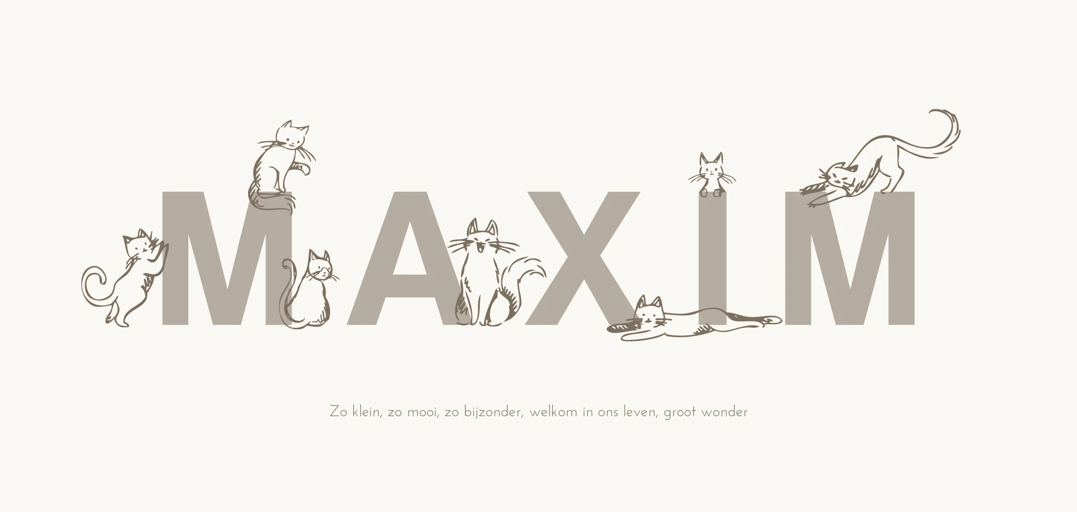Heb je net een klein wonder in huis gehaald en ben je op zoek naar een mooi geboortekaartje? Dan is dit unisex geboortekaartje met neutrale, rustige kleuren perfect voor jou! Op dit geboortekaartje Maxim groot de babynaam van jouw kleine jongen of meisje met op en tussen de letters lijntekeningen van verschillende speelse katten. Dit geboortekaartje is helemaal geschikt voor echte kattenliefhebbers! In de online editor kun je gemakkelijk de teksten, kleuren en lettertypes aanpassen, zodat het geboortekaartje perfect bij jou en je kleintje past.